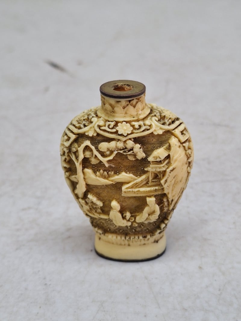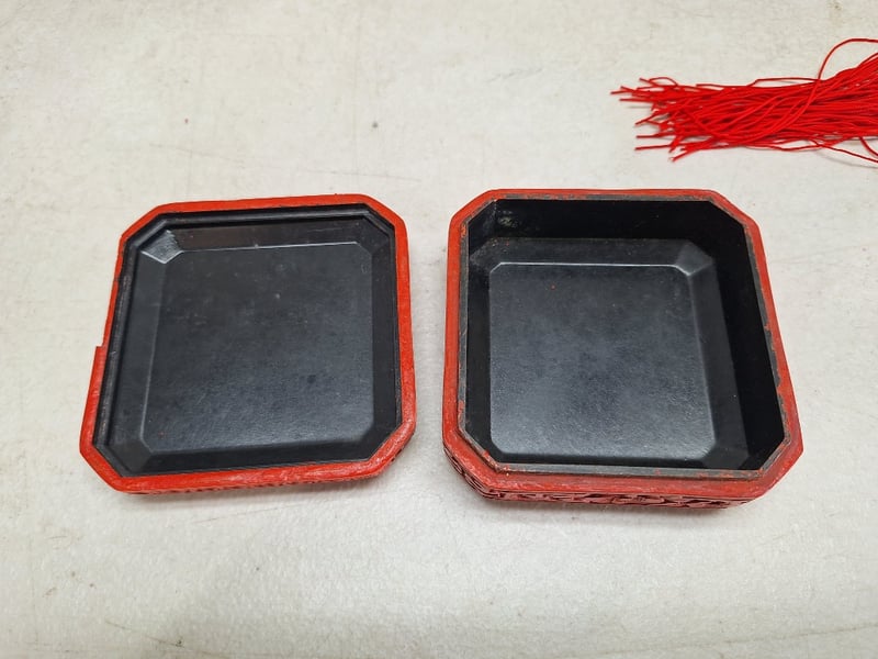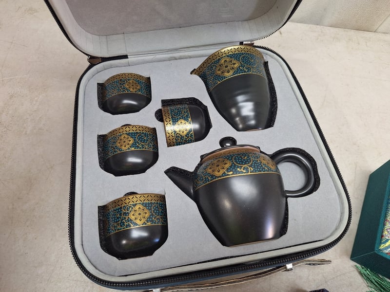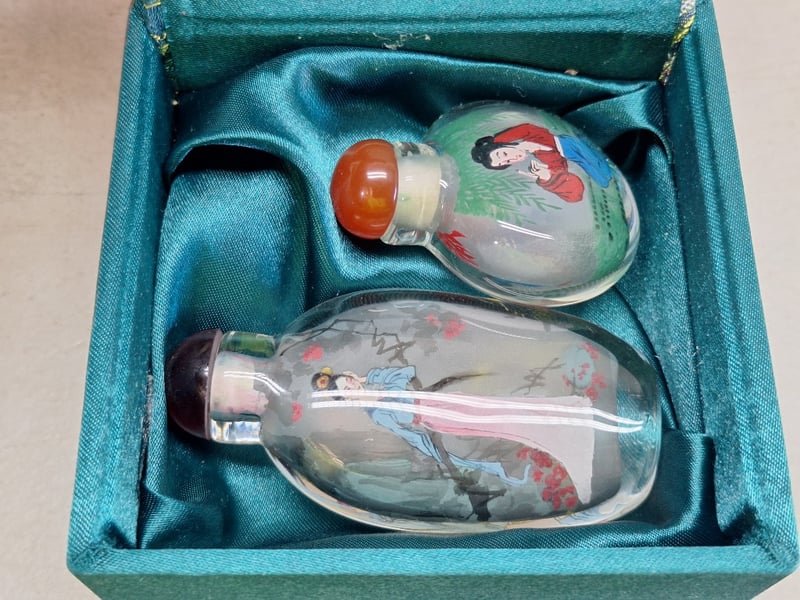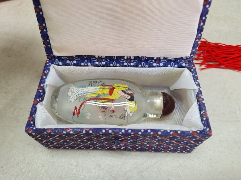 1 x vintage chinese carved cinnabar lacquer trinket box, featuring a crane, 4 x painted chinese snuff bottles in gift box, 1 x painted chinese snuff bottle keychain, 1 x chinese kungfu travel tea set, teapot with 4 x teacups in carrybox