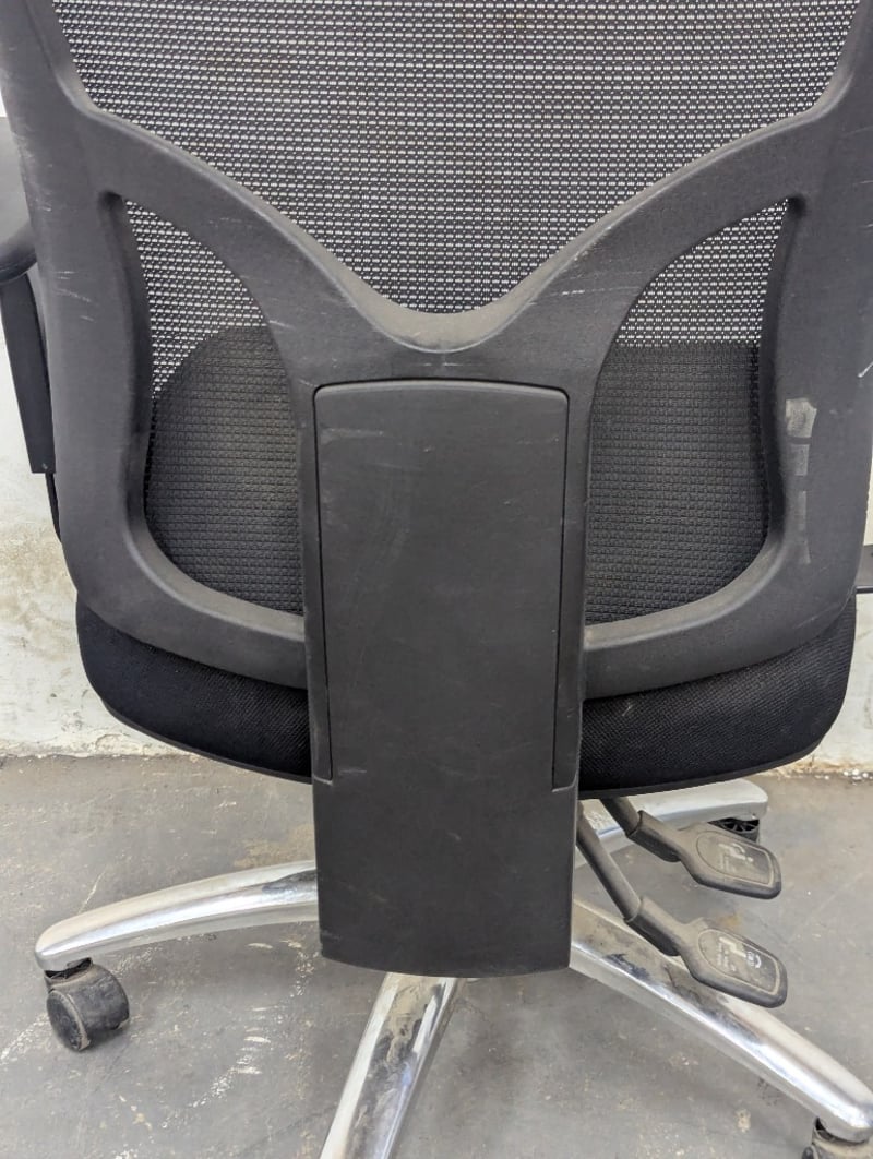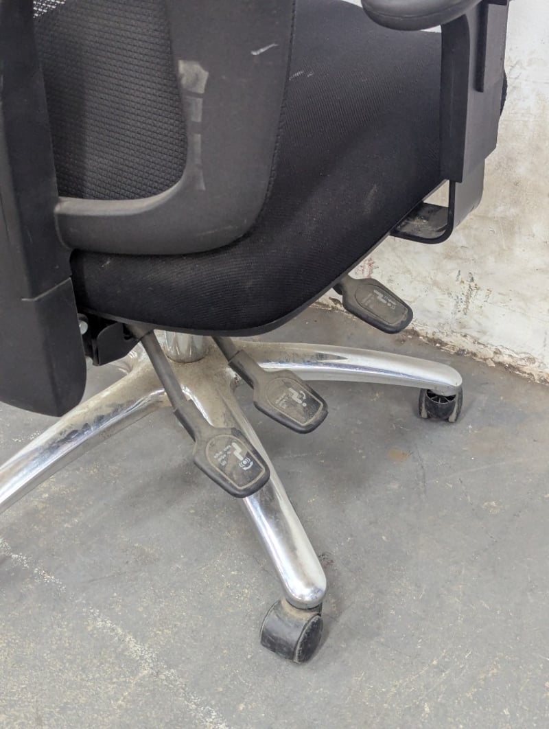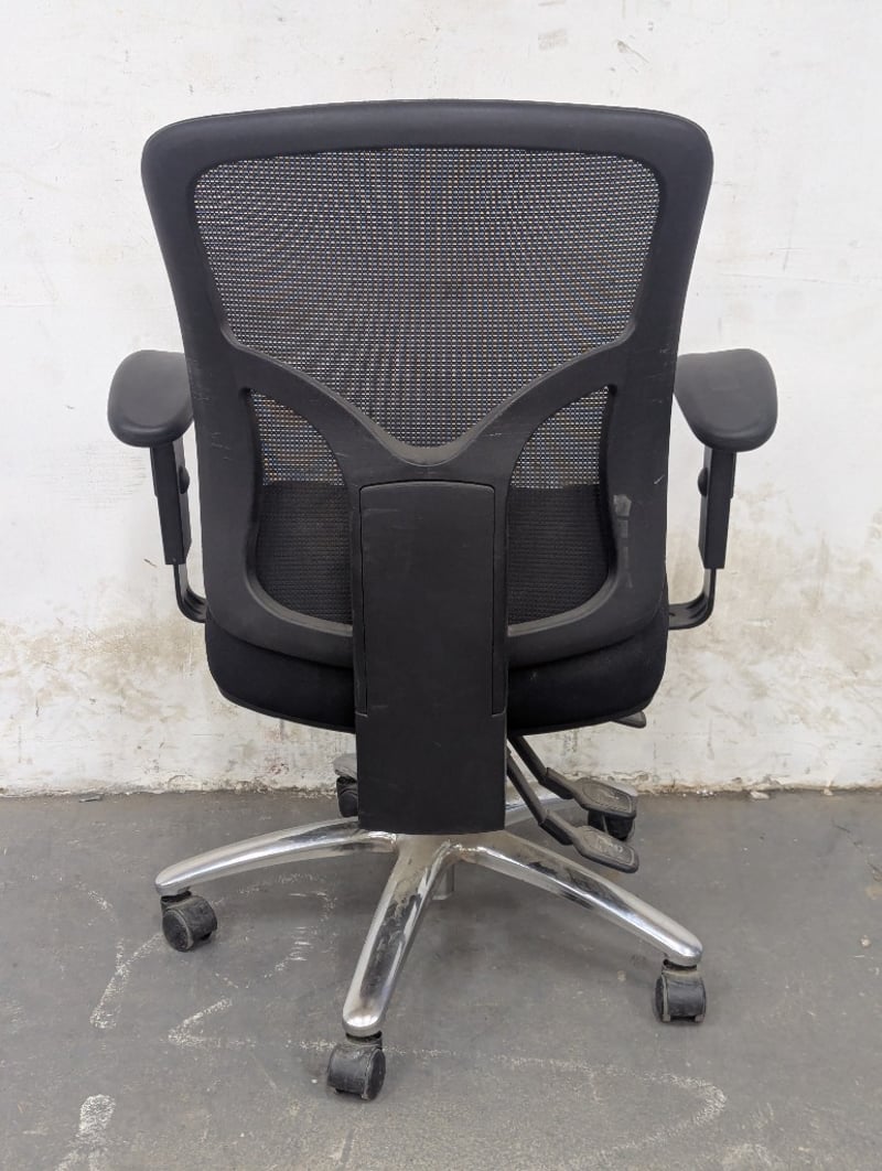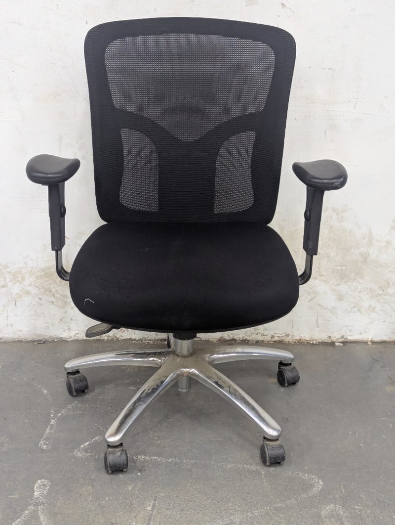 Black mesh office chair featuring a breathable mesh backrest with lumbar support contours and a padded black fabric seat. Equipped with adjustable armrests, pneumatic height adjustment, and a five-star aluminium base with rolling casters.