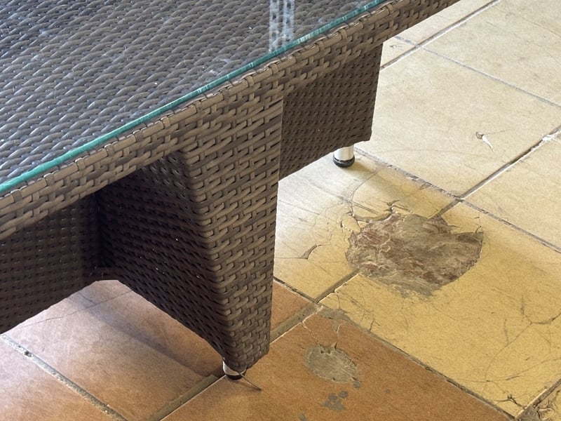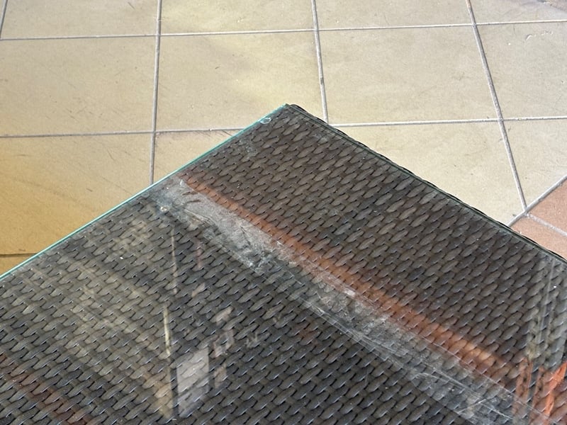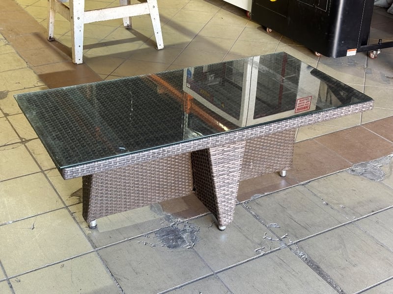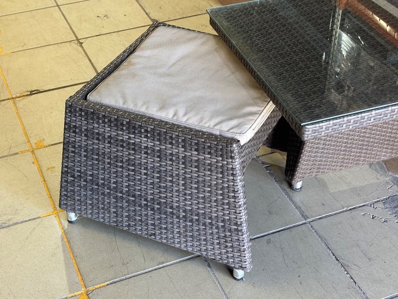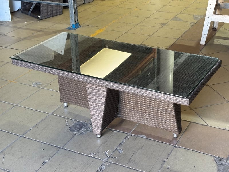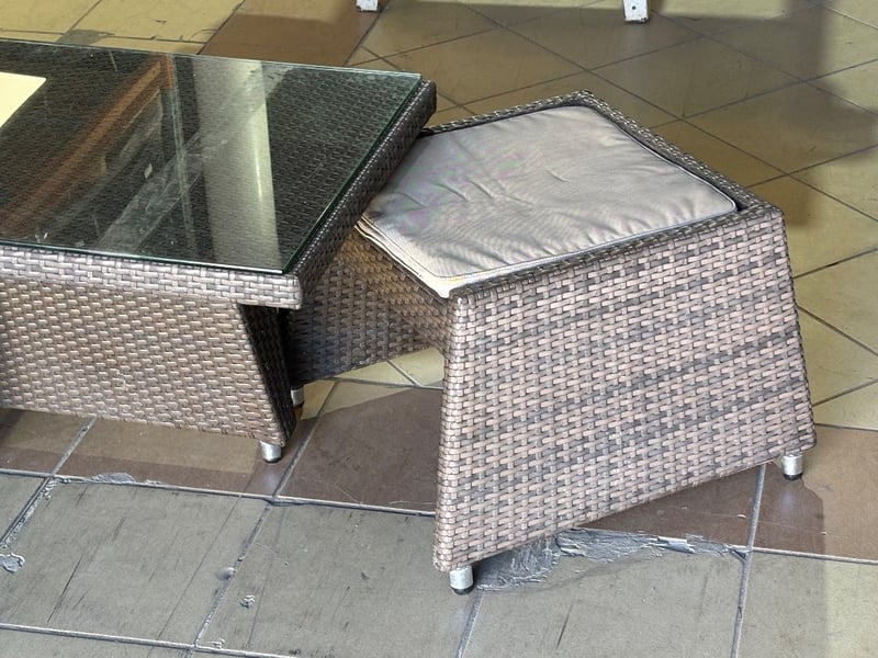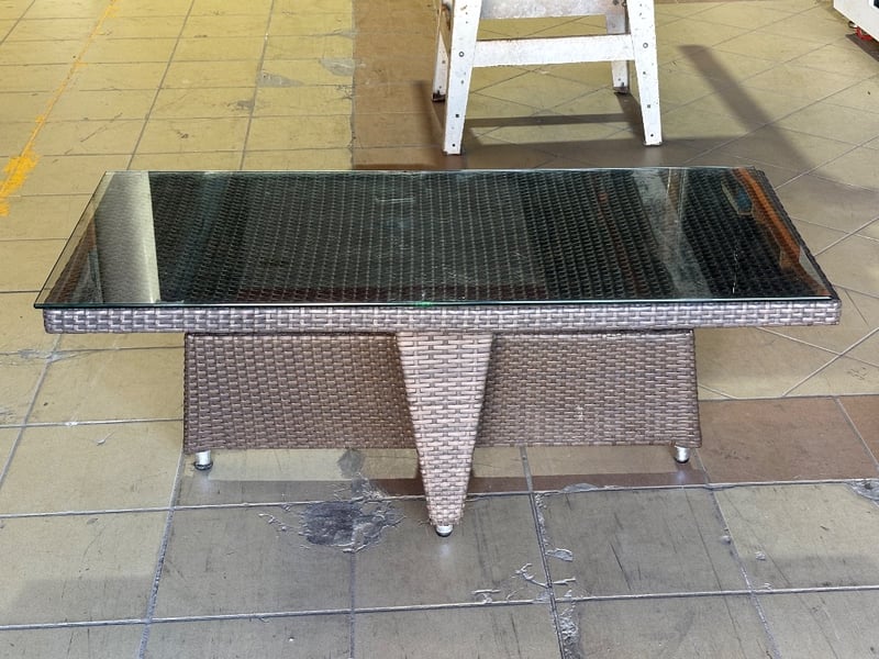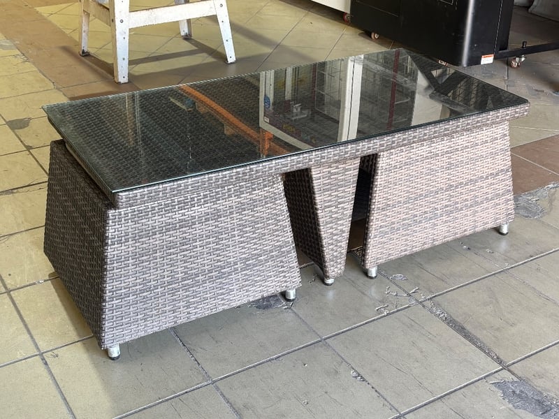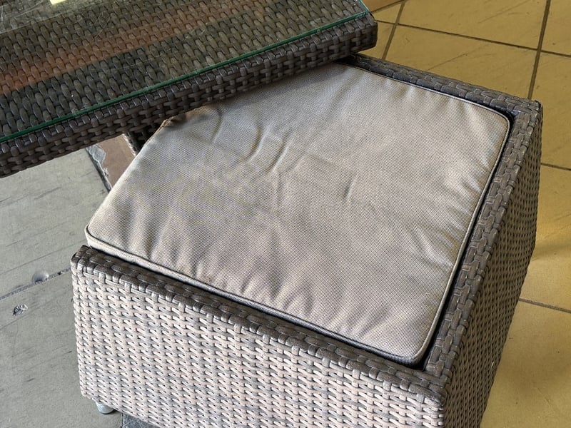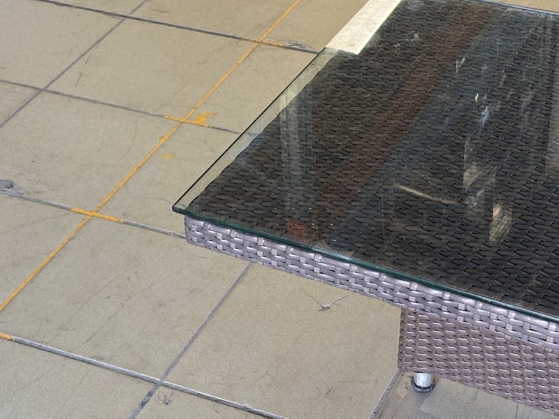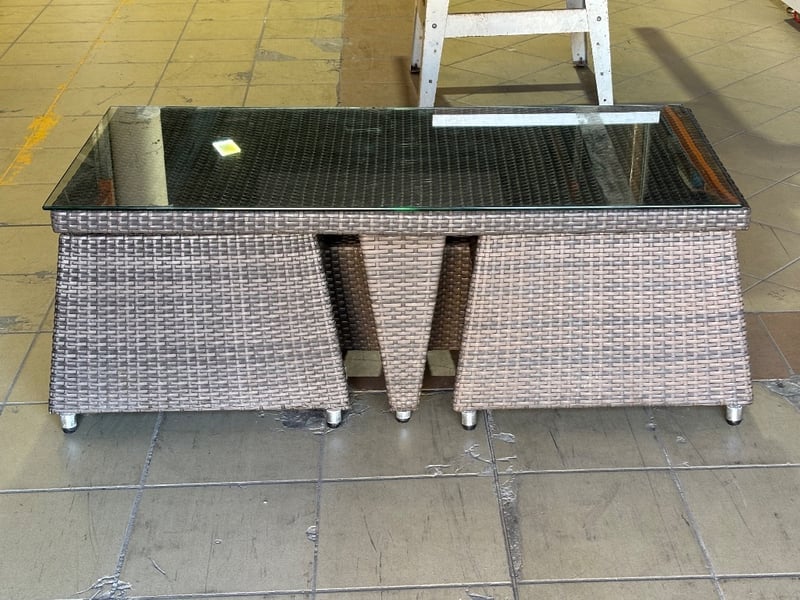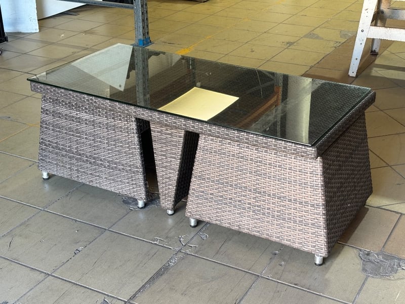 Rattan Outdoor Table Set, Glass Top, Two Rattan Seats with Cushions, Dark Brown Finish