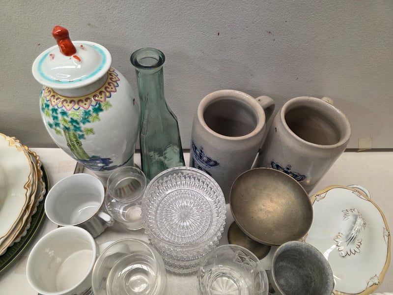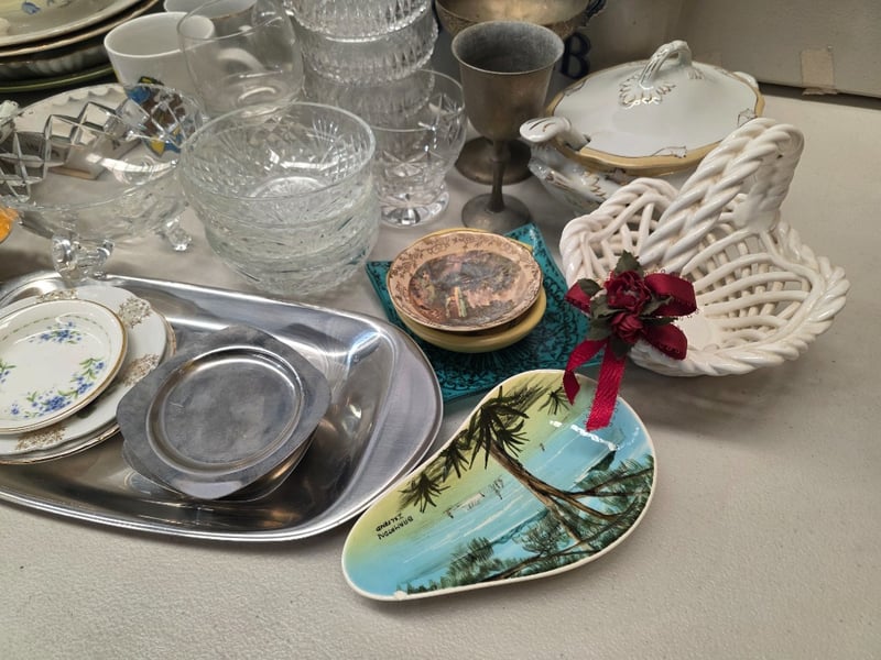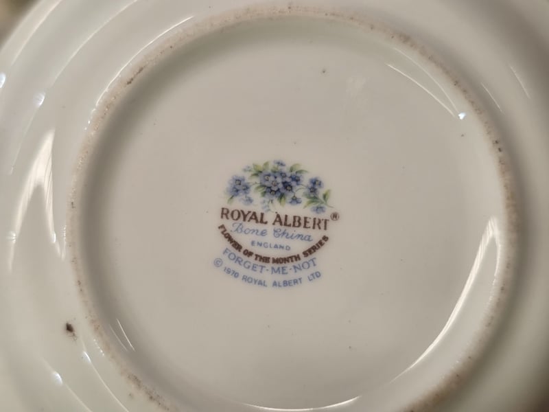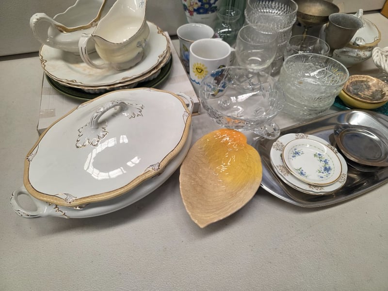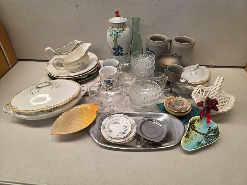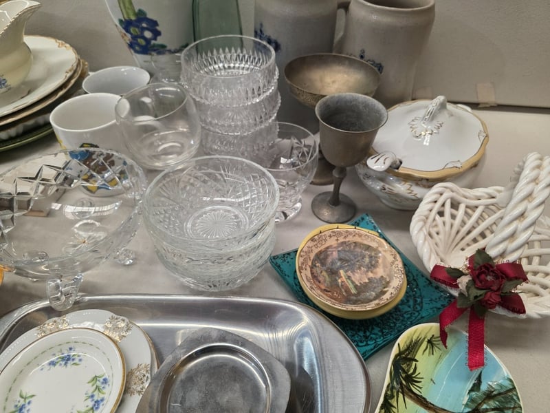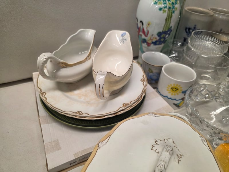 Comprehensive Tableware Collection Comprising English Bone China By Woodsons And Royal Albert 'Forget-Me-Not' Pattern, Complemented By Porcelain Pieces With Floral Motifs. Includes Decorative Serving Vessels With Lids, Leaf-Shaped Dishes In Cream And Yellow Glazes, Multiple Dinner Plates With Gilt-Edged Borders, Handled Cups, And Coordinating Saucers. Glassware Featuring Geometric Patterns, Metal Goblets, And Decorative Ceramic Vessels. Decorative Accessories Include White Porcelain Leaf-Form Di