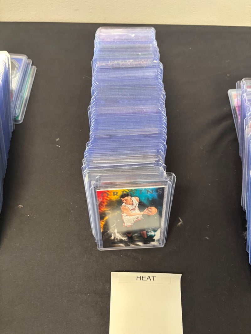 Organized Collection Of Nba Trading Cards Featuring Charlotte Hornets And Miami Heat Teams, Housed In Clear Plastic Sleeves Within Protective Cases. Three Distinct Groupings Display Cards From Various Eras