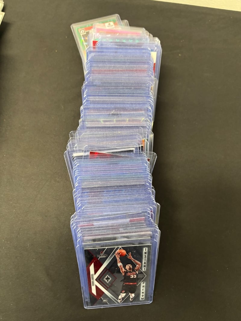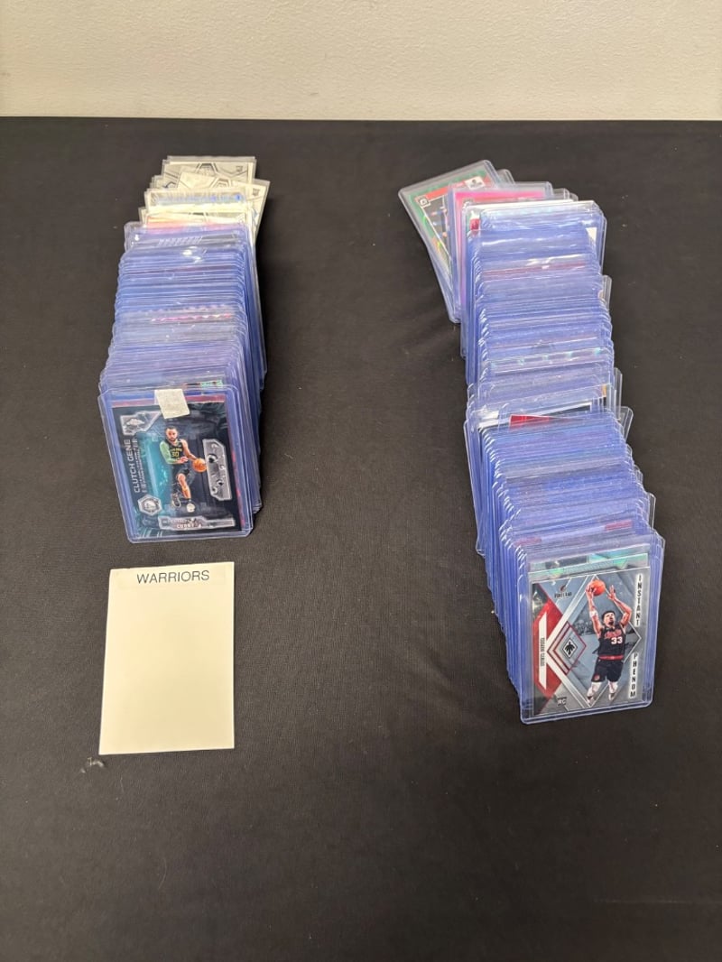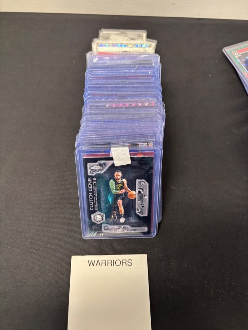 Extensive Collection Of Golden State Warriors Basketball Trading Cards Housed In Clear Protective Sleeves And Organized In Stackable Acrylic Cases.