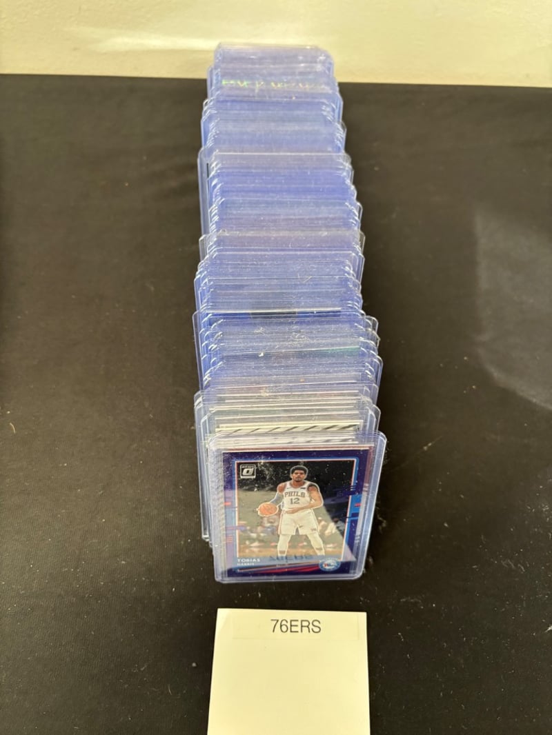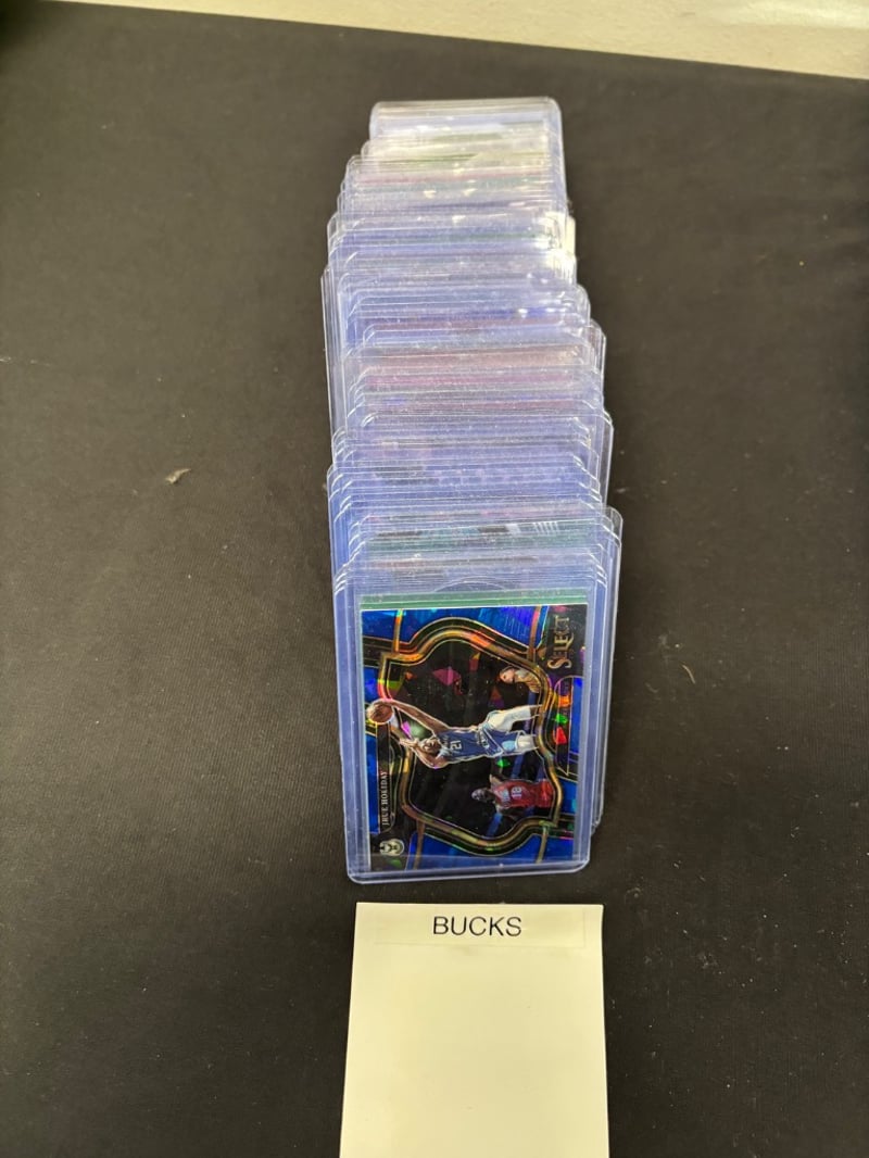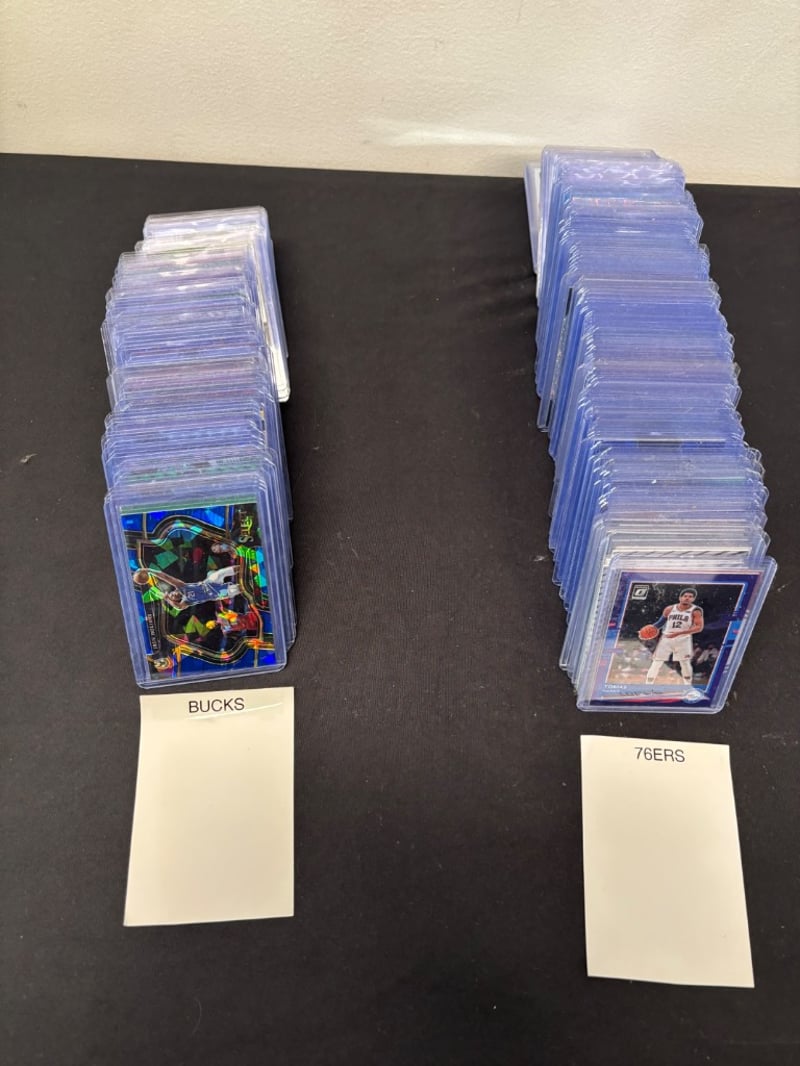 Organized Collection Of Nba Trading Cards Featuring Milwaukee Bucks And Philadelphia 76Ers Players, Housed In Clear Protective Sleeves And Stacked In Acrylic Cases.