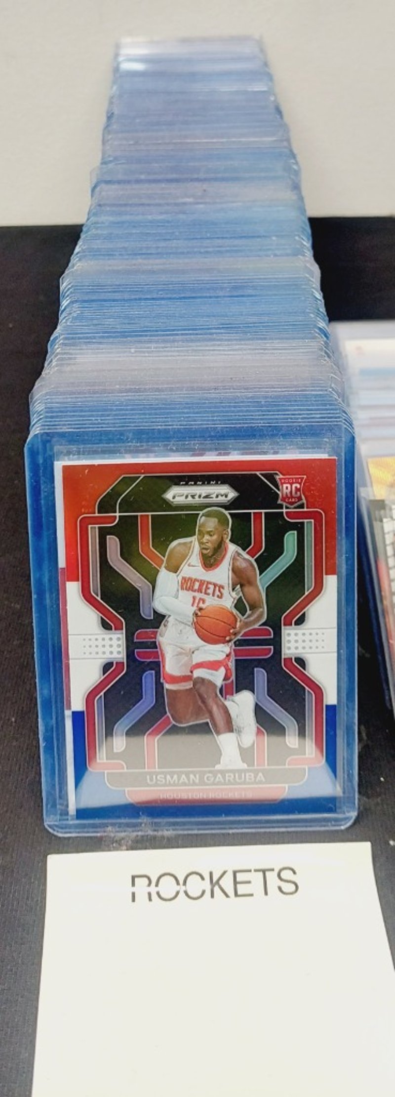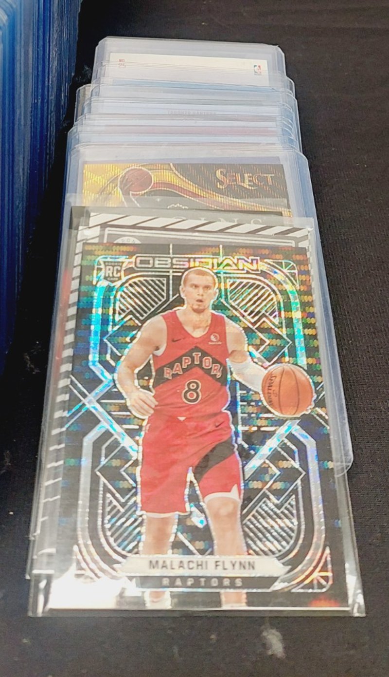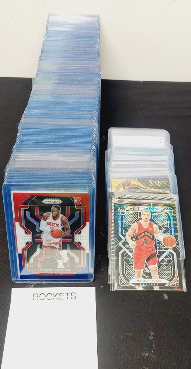 Curated Collection Of Nba Basketball Trading Cards Featuring Houston Rockets And Toronto Raptors Players, Including Usman Garuba Prizm Cards In Blue Protective Cases And Malachi Flynn Obsidian Select Cards In Clear Sleeves