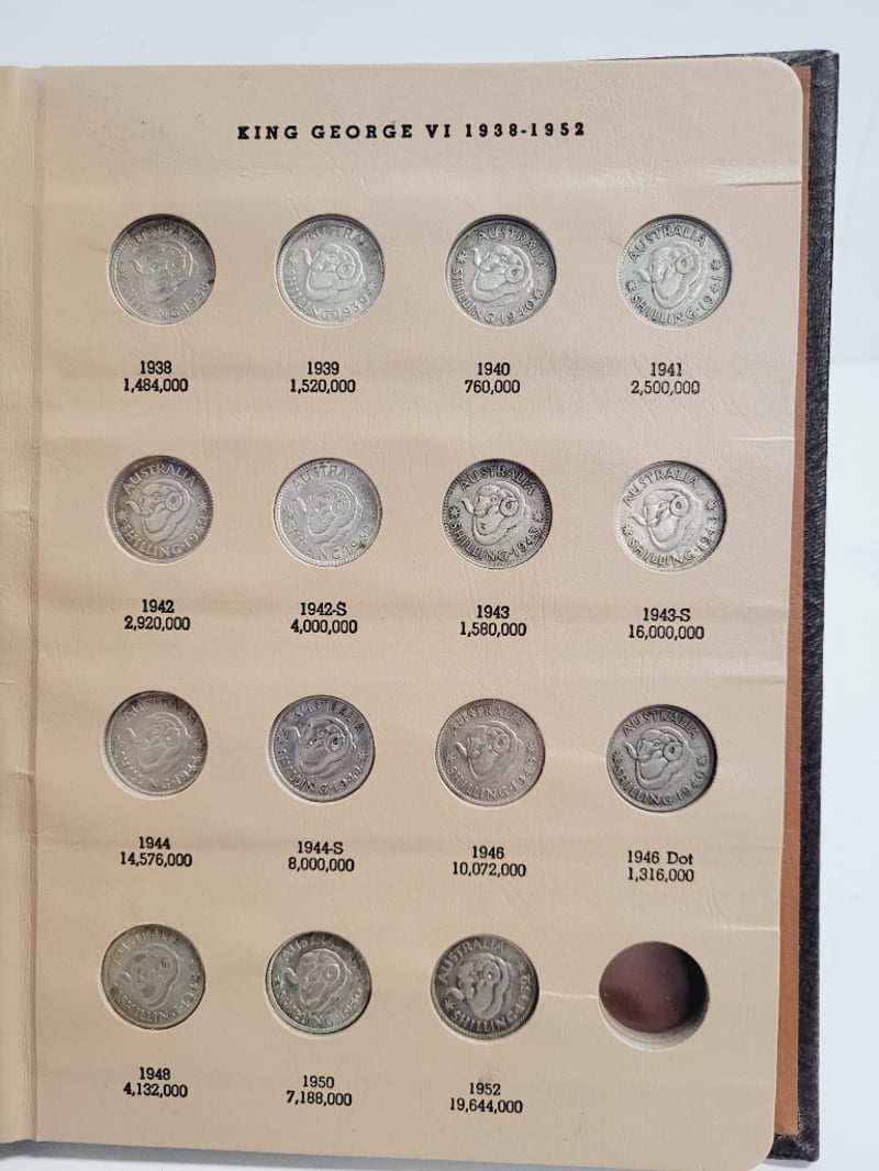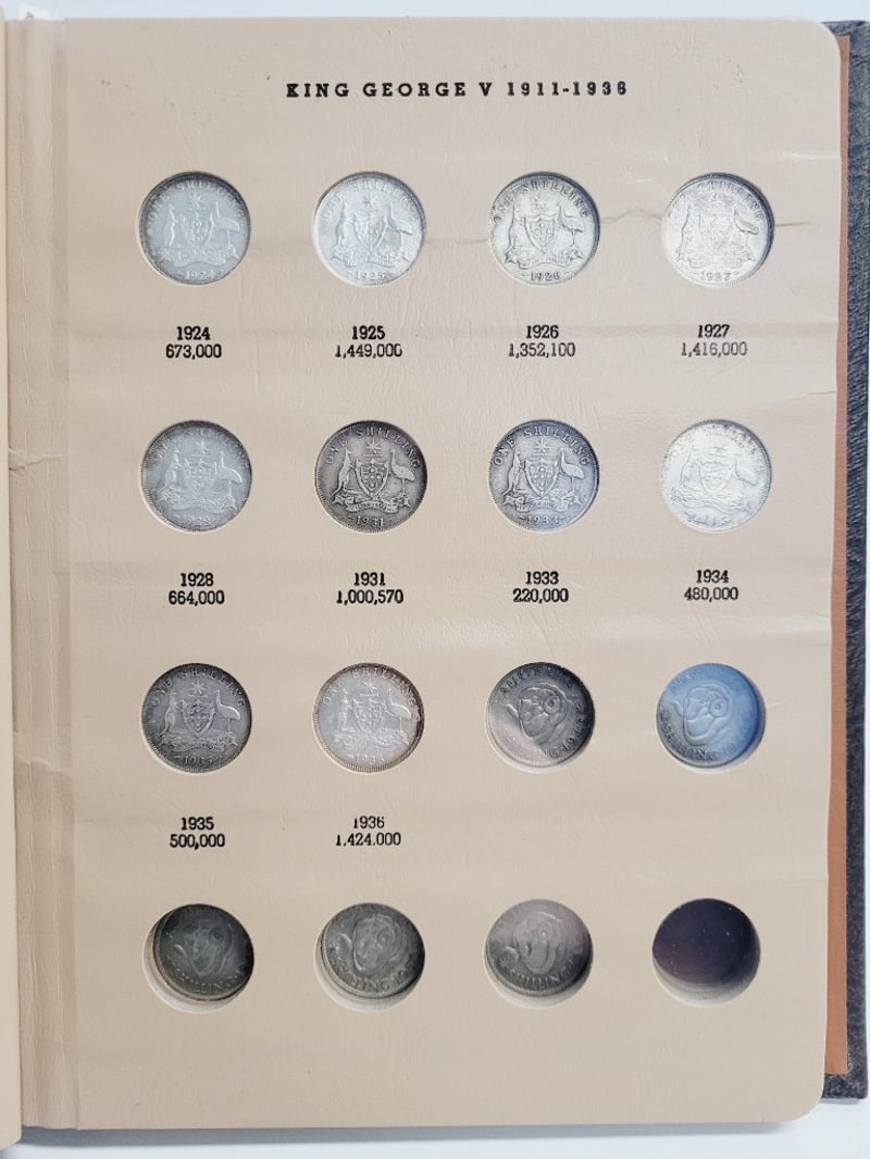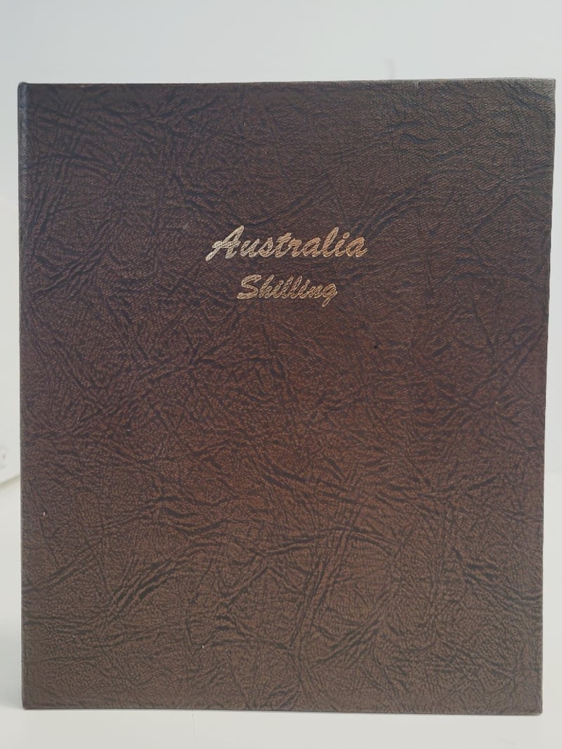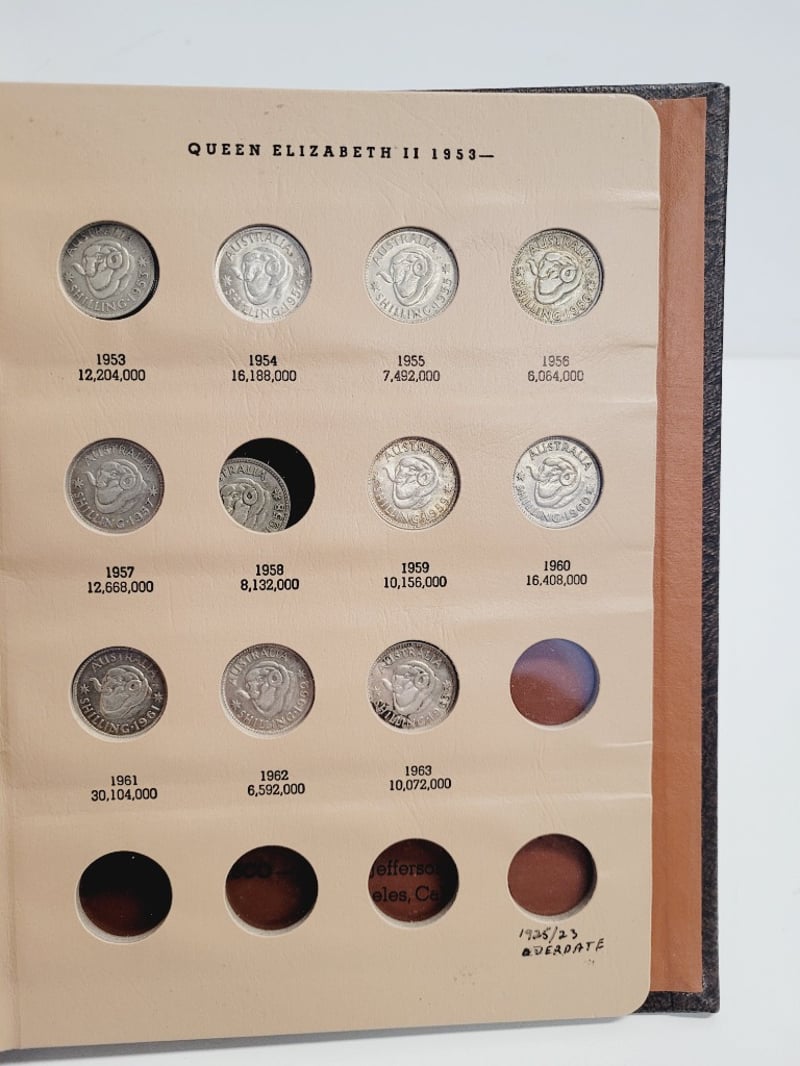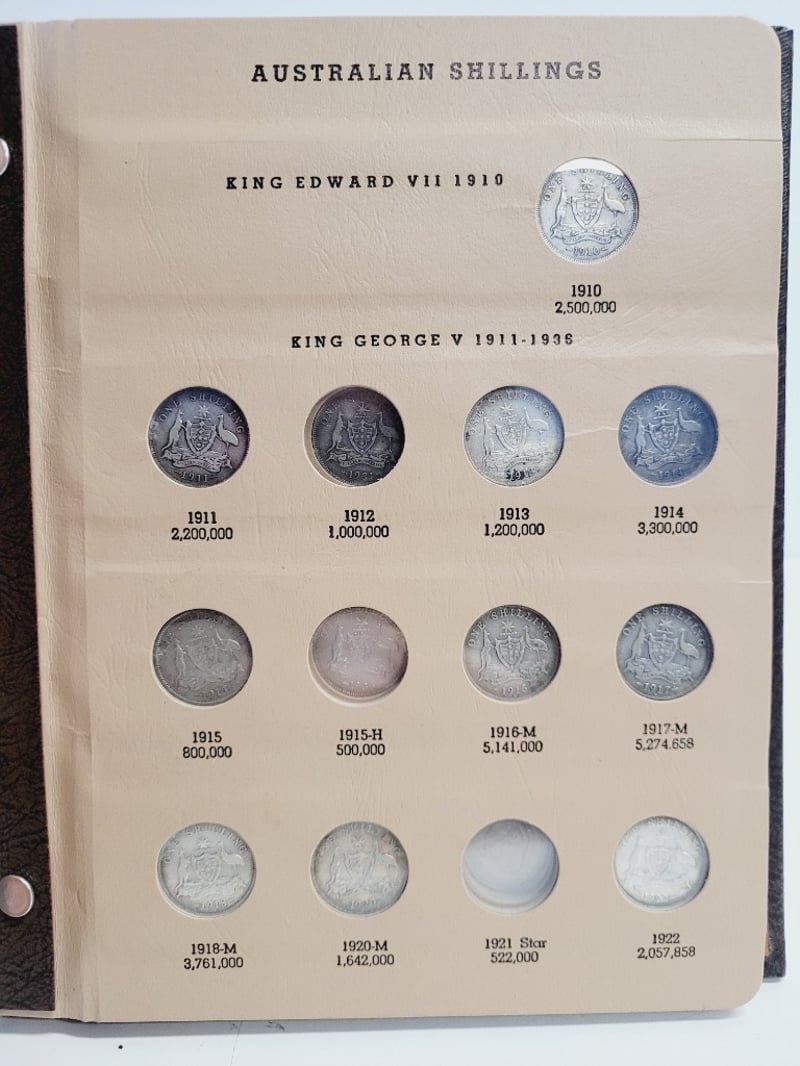 WORLD COIN LIBRARY - AUSTRALIA SHILLING COLLECTION ALBUM Comprehensive Australian Shilling Collection Album Featuring Coins From King Edward Vii (1910) Through Queen Elizabeth Ii (1953-1963). Bound Leather Cover With Gilt Lettering. Contains Documented Specimens With Mintage Figures Including Rare Dates Such As 1921 Star And 1946 Dot Varieties. Produced By Dansco, Los Angeles. Condition: Fair - Refer To Images 488600+26