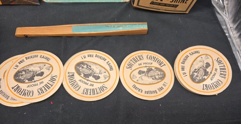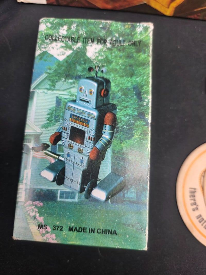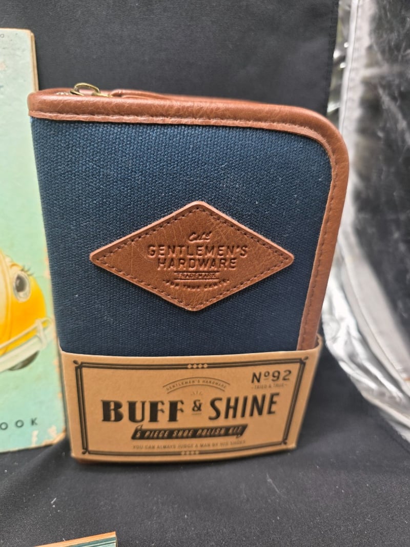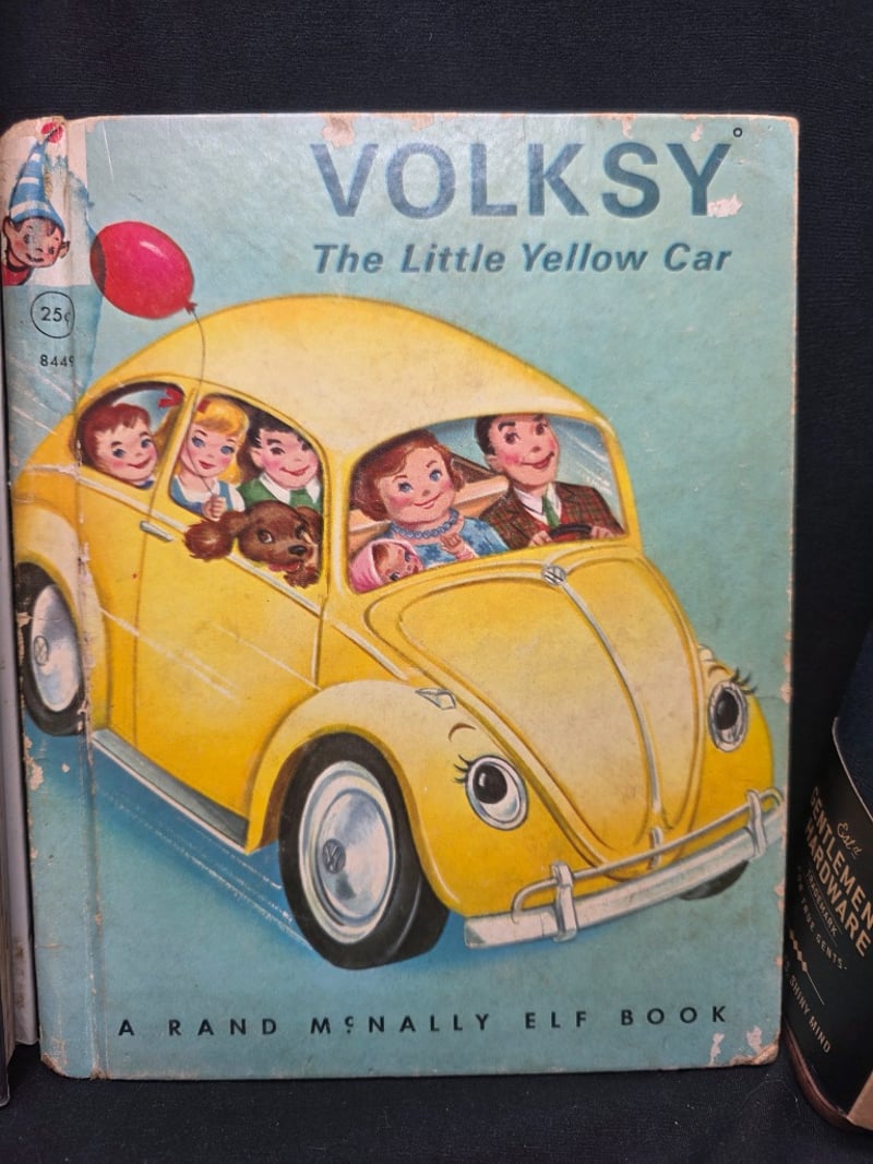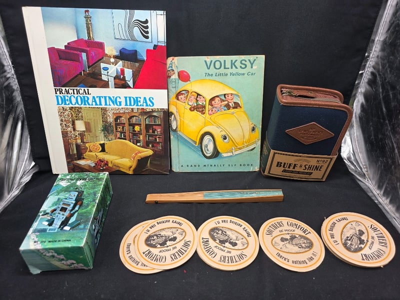 ASSORTMENT OF VINTAGE COLLECTIBLES Item Size: Height: 30cm, Width: 30cm, Depth: 30cm, Weight: 0.4Kg Charming Collection Comprising Of: 1856 Volksy The Little Yellow Car, "Practical Decorating Ideas" Hardcover, Buff And Shine Shoe Shine Kit, Walking Wind Up Robot, Wooden Fan And Southern Comfort Coasters. Condition: Fair - Refer To Images 584542+3