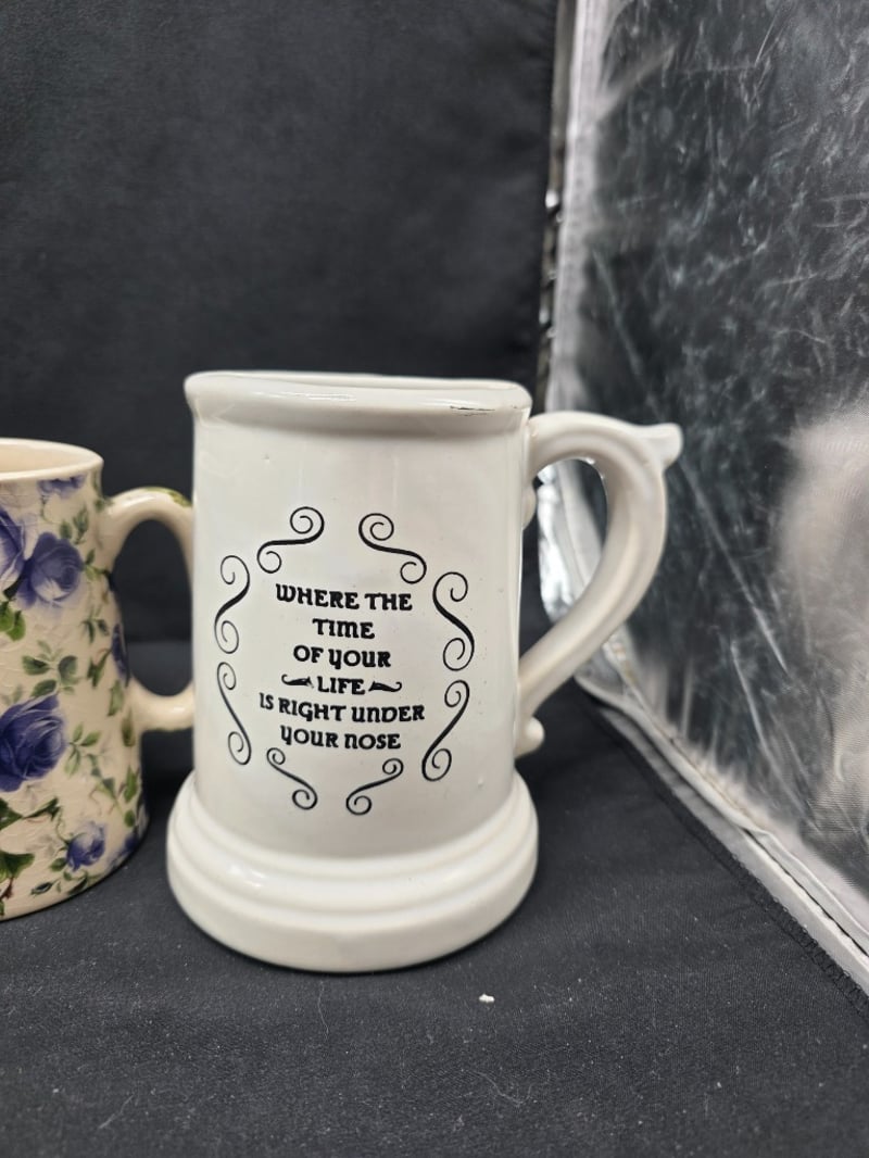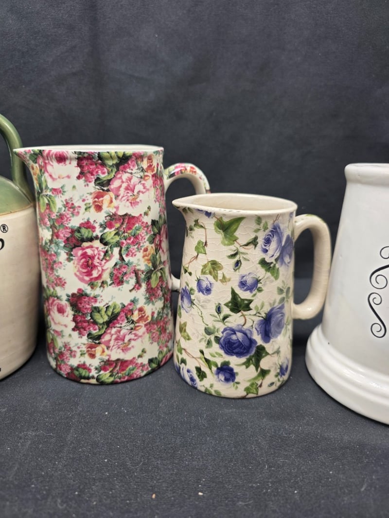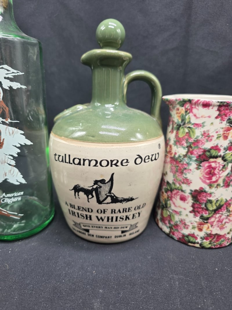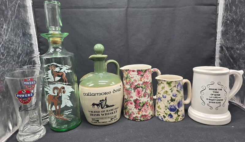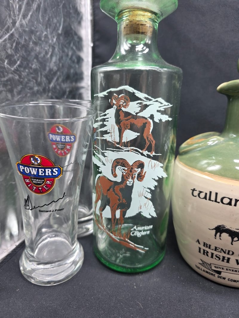 ASSORTMENT OF GLASSWARE INCLUDING WHISKEY JUG, FLOWER TEAPOTS, POWER BEER GLASSES AND AMERICAN BIGHORN BOTTLE