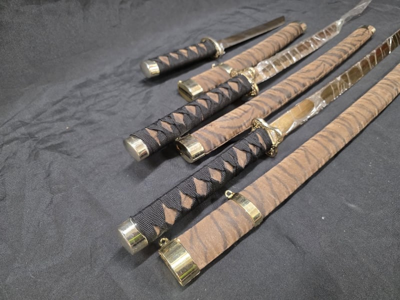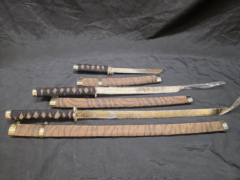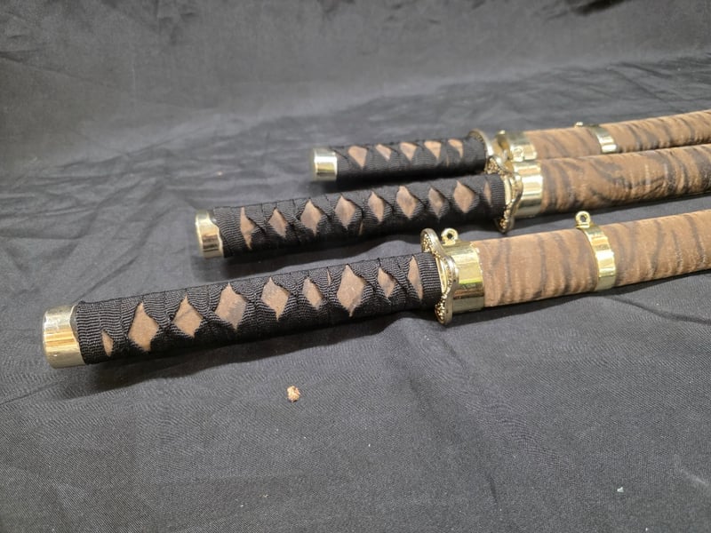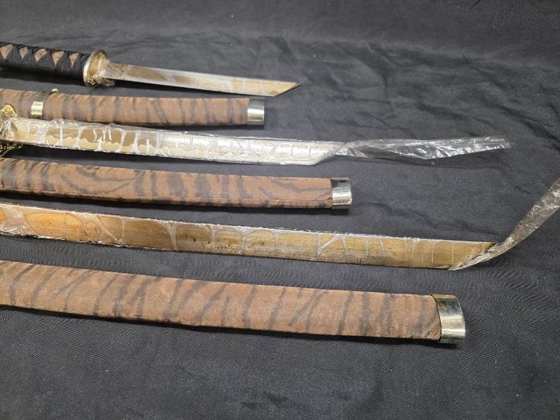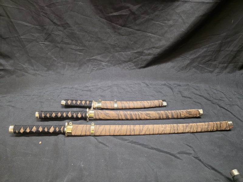 THREE DECORATIVE/COLLECTOR SWORDS Item Size: Height: 70cm, Width: 30cm, Depth: 15cm, Weight: 3Kg Metal Curved Blade, Handle Features Wrapped Grip And Plastic Guard. Condition: Good - Refer To Images 584472+17