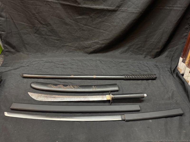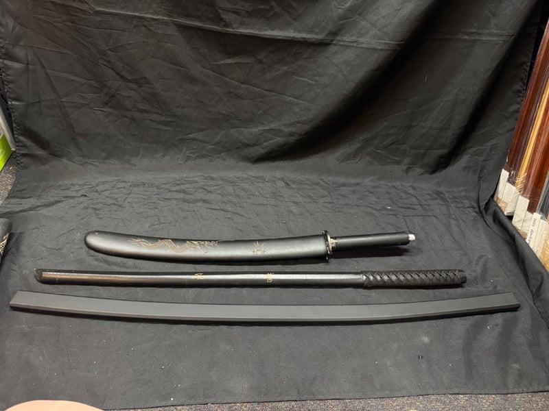 TWO DECORATIVE/COLLECTOR SWORDS, ONE DECORATIVE WOODEN SWORD Item Size: Height: 4cm, Width: 100cm, Depth: 5cm Metal Curved Blade, With Wooden Handles Condition: Fair - Refer To Images 584472+34