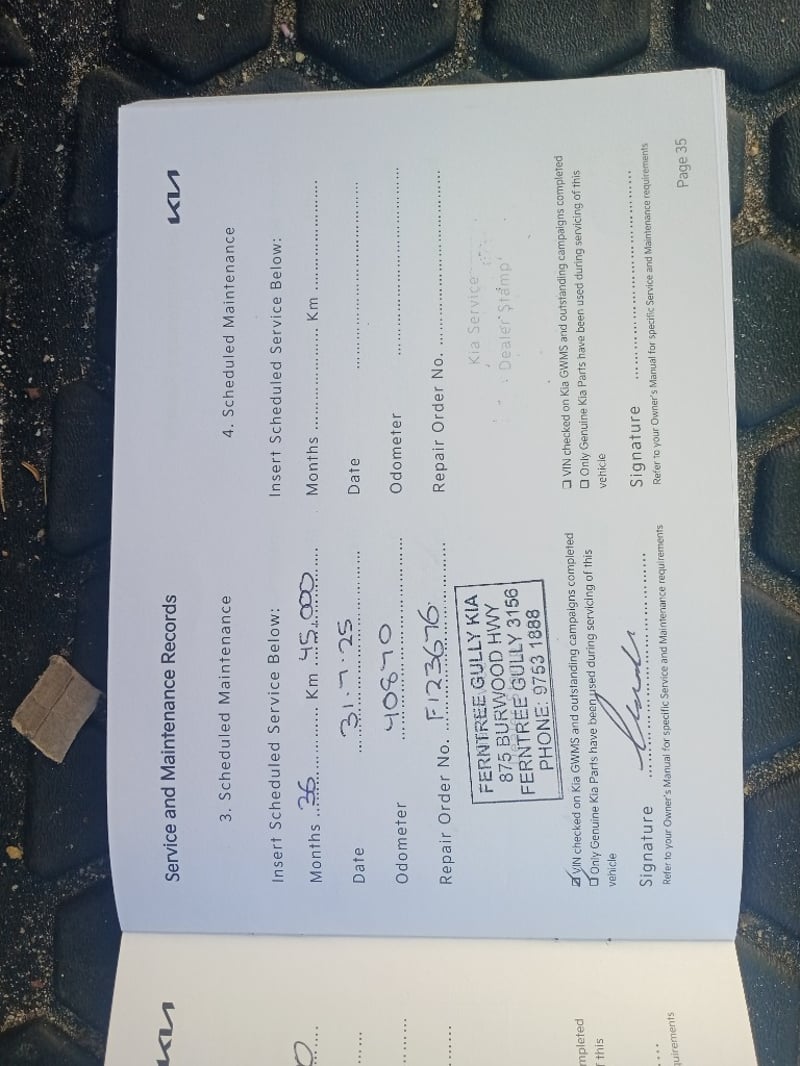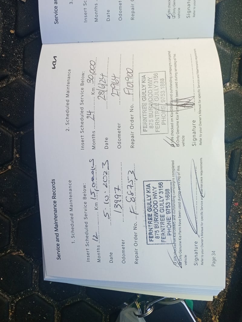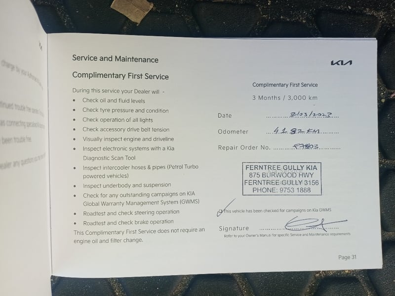 * Service logbook with complimentary first service completed at Ferntree Gully Kia (dated 28/03/2023, 41.2km)