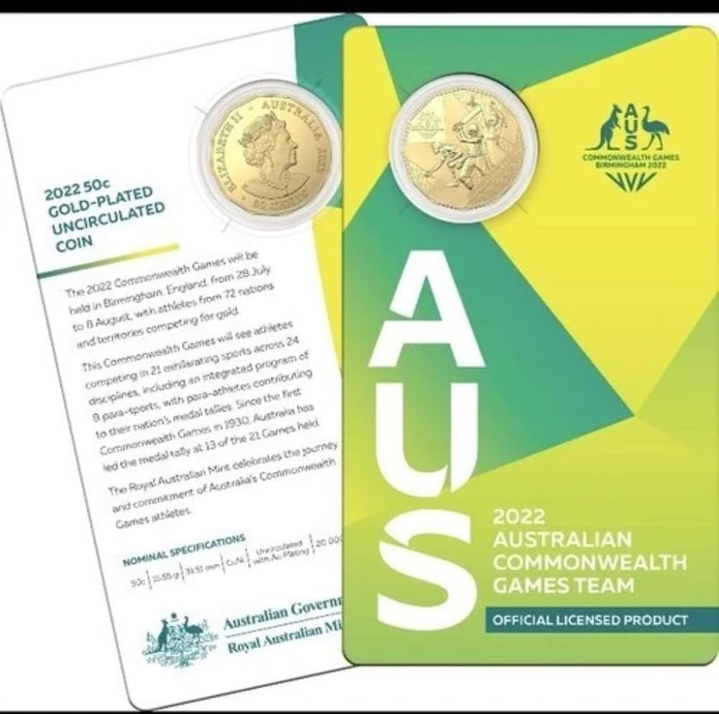 2022 GOLD PLATED 50 CENT AUSTRALIAN COMMONWEALTH GAMES TEAM UNC COIN ON CARD 10244+23