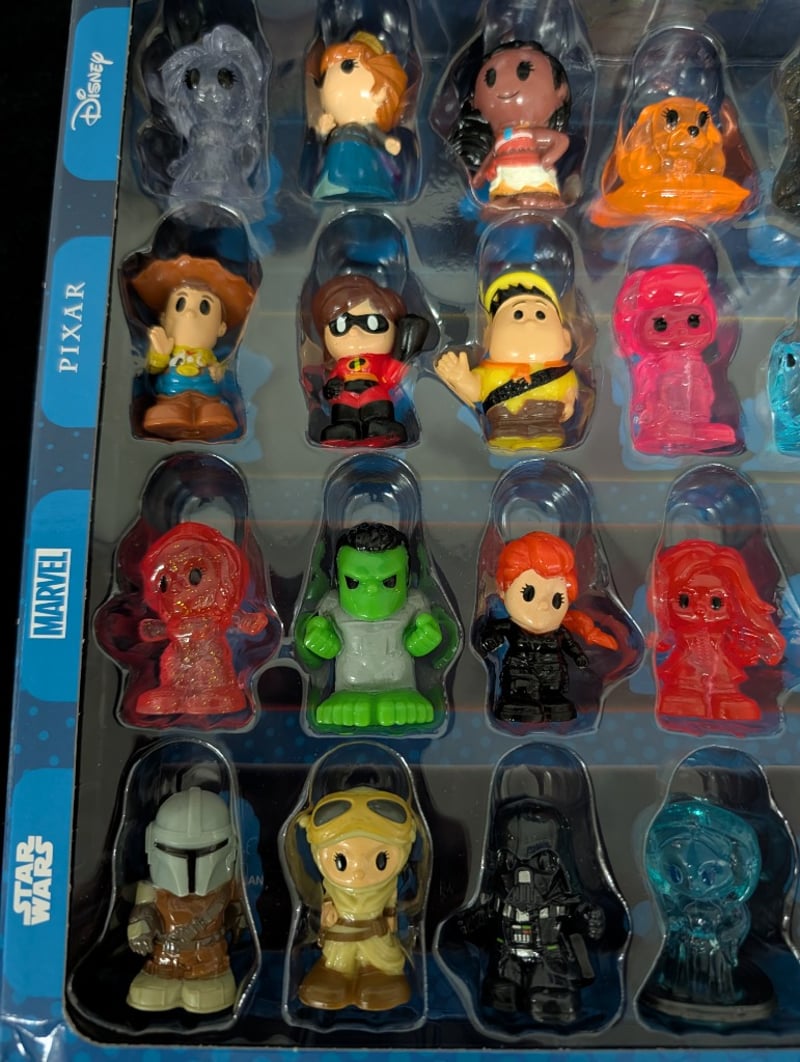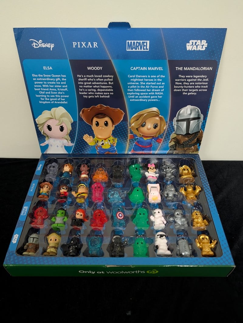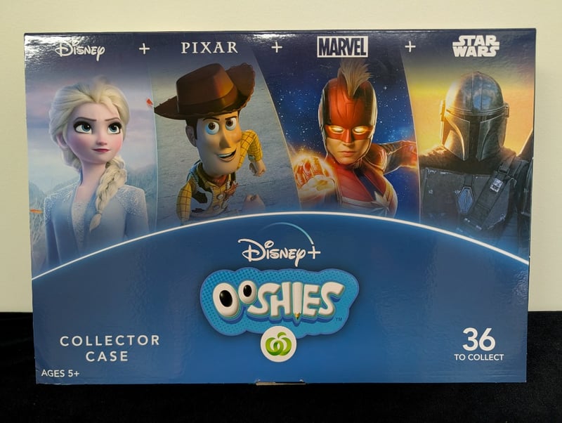 DISNEY+ OOSHIES COLLECTOR CASE - 36 PIECE SET (WOOLWORTHS EXCLUSIVE)Item Size: Height: 28cm, Width: 38cm, Depth: 12cmComplete Disney+ Ooshies Collector Case Featuring 36 Collectible Figurines Spanning Disney, Pixar, Marvel, And Star Wars Franchises. Includes Elsa, Woody, Captain Marvel, And The Mandalorian As Featured Characters. Housed In Original Blue Woolworths-Exclusive Display Case With Individual Clear Dome Compartments. Figures Showcase Varied Finishes Including Translucent, Metallic Gold, And Solid Color Variants. Suitable For Ages 5+.Condition: Good - Refer To Images584585+18
