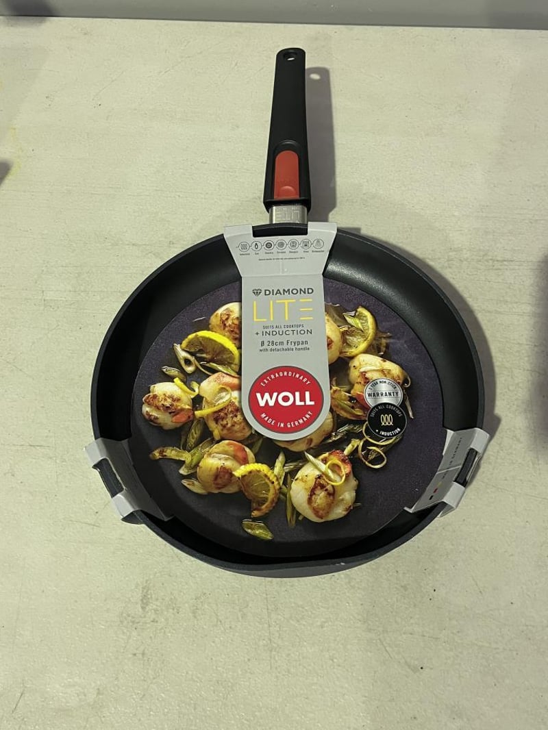 RRP $389 Woll Diamond Lite Detach Handle Induct Frypan 28cm - REFURBISHED WORKING GOOD/ OK CONDITION (NOTE: HANDLE DOES SEEM LOOSE/DENT ON FRONT REFER TO PHOTO)