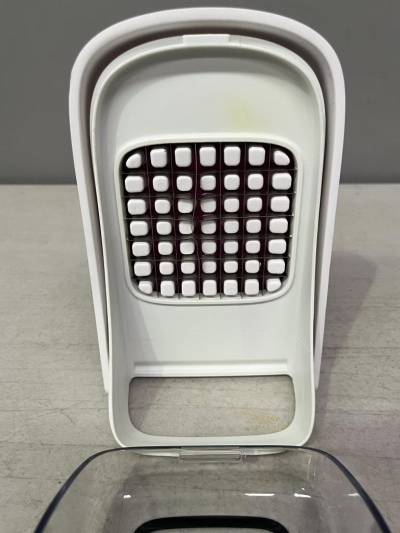 RRP $99 OXO Good Grips Vegetable Chopper with Easy-Pour Opening - White - REFURBISHED WORKING OK/ FAIR CONDITION (SIGNS OF FREQUENT USE/ DOES SHOW SOME DISCOLOURISATION/METAL BENT REFER TO PHOTO)