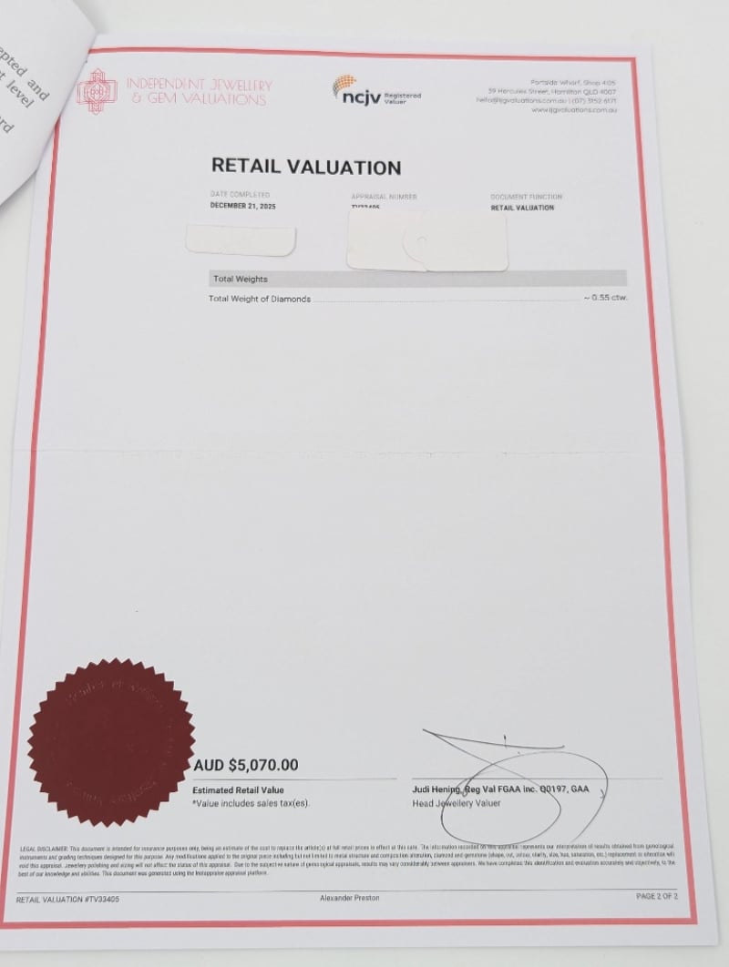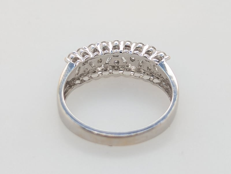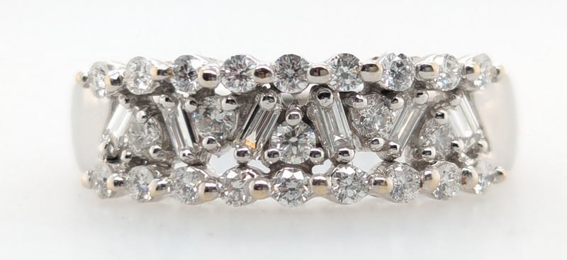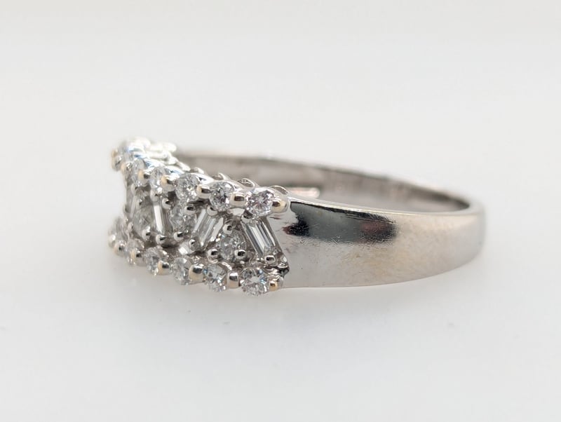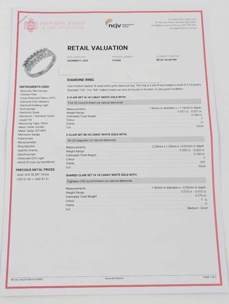 18K WHITE GOLD DIAMOND RING Ring Features Twenty-Three Round Brilliant Cut Diamonds, Colour: F - G, Clarity: I1,Six Baguette Cut Diamonds In Two Claw Settings Across Ring Front, Clarity: Vs1, Colour: FTotal Diamond Weight: ~0.55Ct Total Item Weight: 4.10g Markings: Stamped: 750 Condition: Good - Refer To Images This valuation has been conducted by an independent third-party professional. The valuation amount is an assessment by the issuing valuer and does not reflect the auction value of the item. Any inquiries regarding the valuation should be directed to the issuing valuer (refer to contact details on the certificate), as Lloyds Auctions has no affiliation or influence over the valuation, the valuer, or the stated amount. Insurance Replacement Valuation Amount: $5,070.00 582958+10