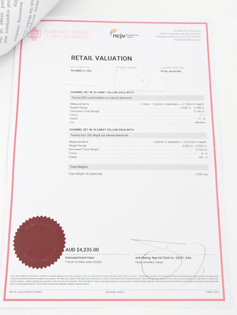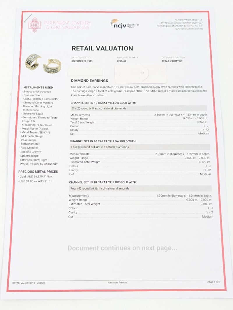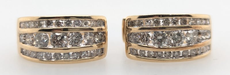 PAIR OF 10K YELLOW GOLD EARRINGS Earrings Feature Channel Set Round Brilliant Cut Diamonds, Total Diamond Weight: ~0.80Ct Diamond Colour Includes: I-J / G-H,Diamond Clarity Includes: I1-I1 / Si2-I1 Total Item Weight: 4.30g Markings: Stamped: 10K Condition: Good - Refer To Images This valuation has been conducted by an independent third-party professional. The valuation amount is an assessment by the issuing valuer and does not reflect the auction value of the item. Any inquiries regarding the valuation should be directed to the issuing valuer (refer to contact details on the certificate), as Lloyds Auctions has no affiliation or influence over the valuation, the valuer, or the stated amount. Insurance Replacement Valuation Amount: $4,235.00 582958+4