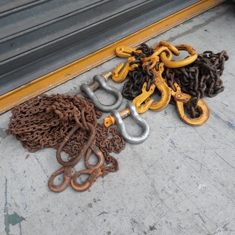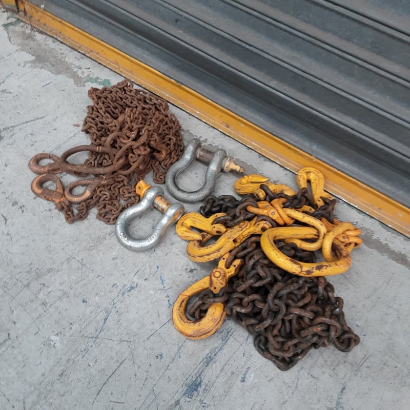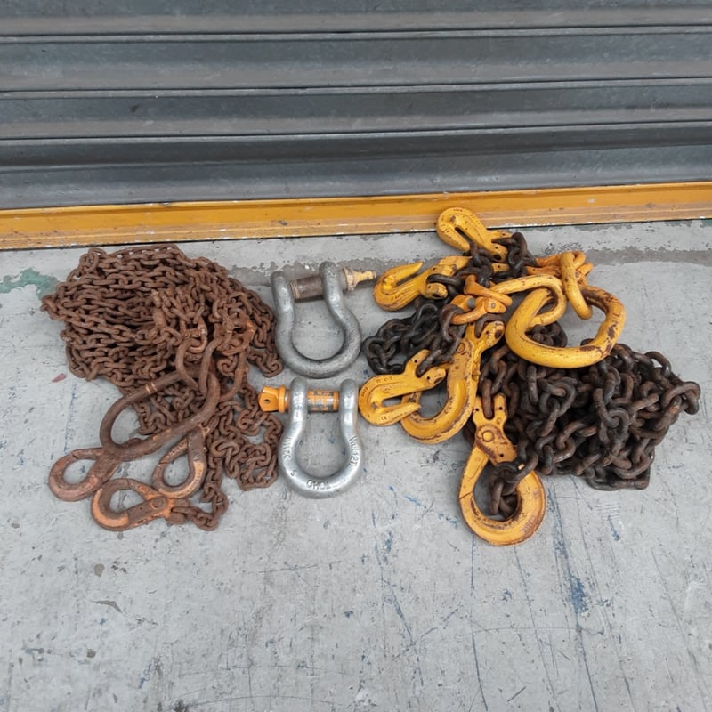Industrial lifting and rigging equipment lot comprising chain slings in varying conditions. Includes rust-patinated brown chain sling with integral loops, bright yellow painted chain sling with matching hooks and shackles, and dark brown oxidised chain sling. Two galvanised steel bow shackles with safety pins included. Yellow painted hook assemblies feature reinforced eye bolts and load-rated construction. Equipment shows authentic working wear consistent with heavy industrial use.