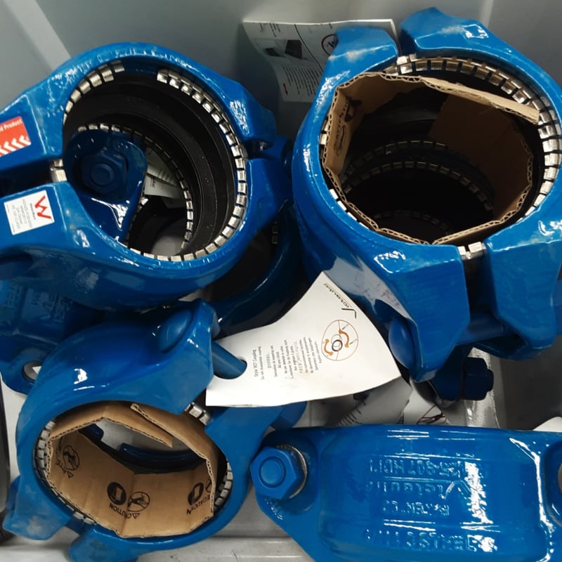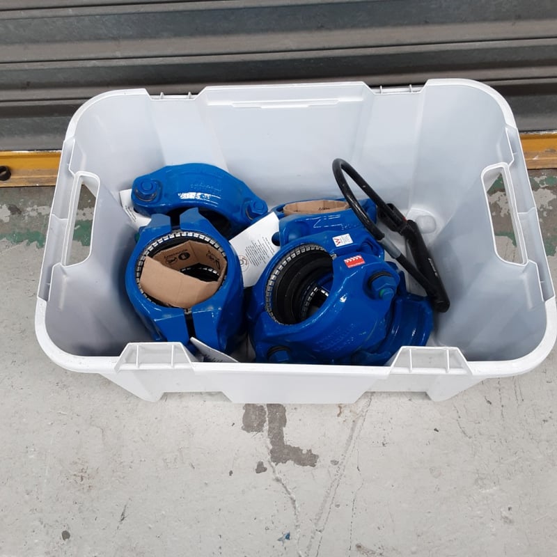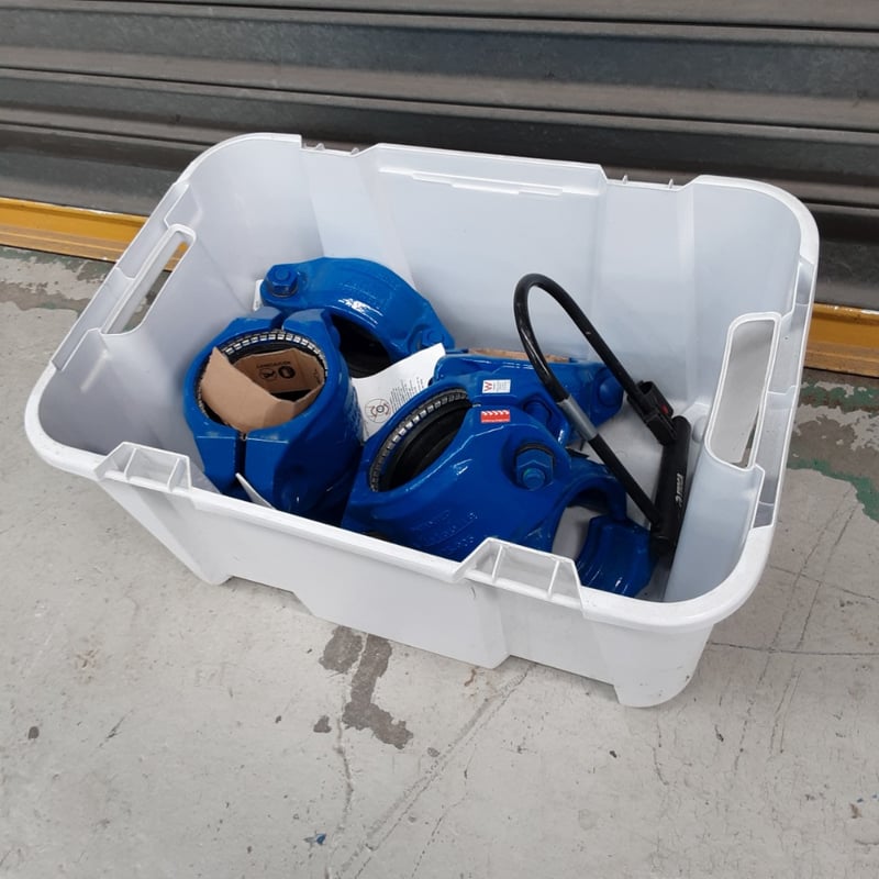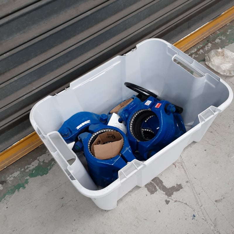 Lot comprises cast iron water meters with brass measurement dials, housed in a white plastic storage crate.