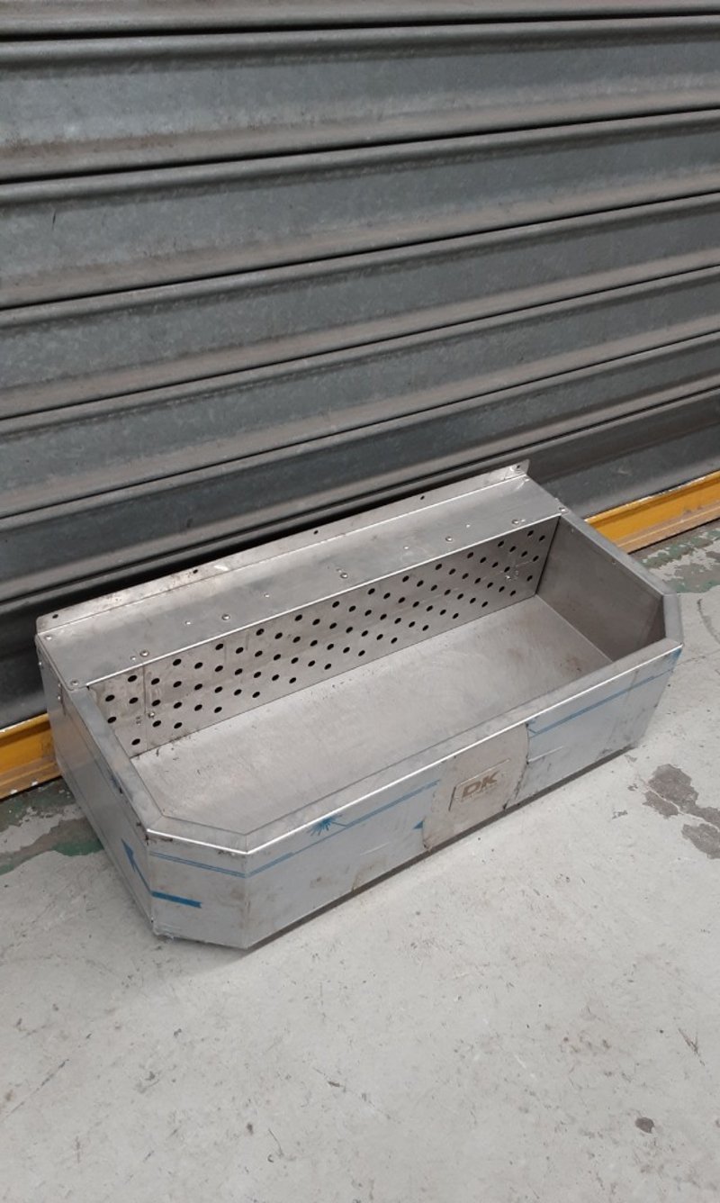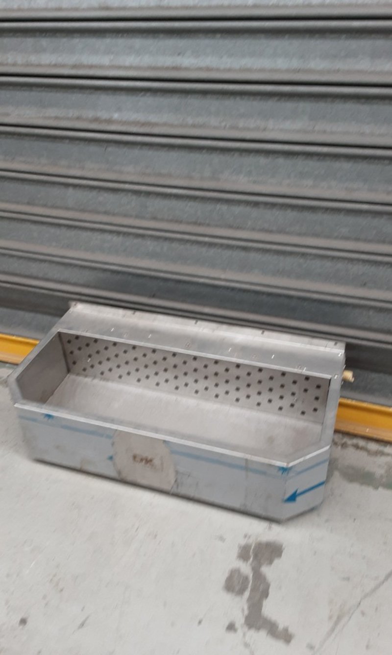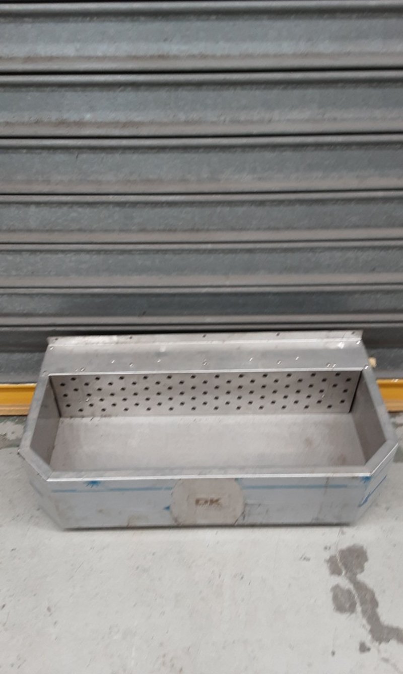Aluminium sterilising tray with removable perforated insert divider. The tray features a rectangular design with sloped sides and integrated handles for easy transport. The perforated stainless steel insert allows for drainage and air circulation during sterilisation processes. The base tray is constructed from aluminium.