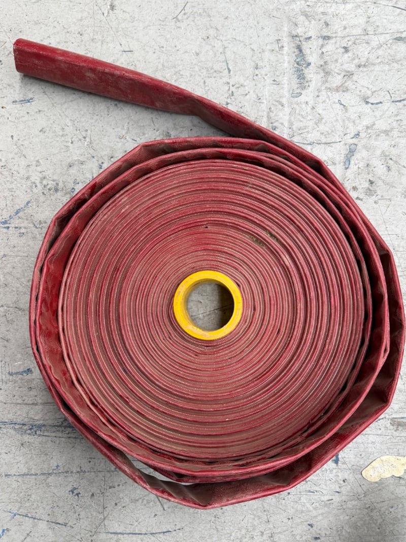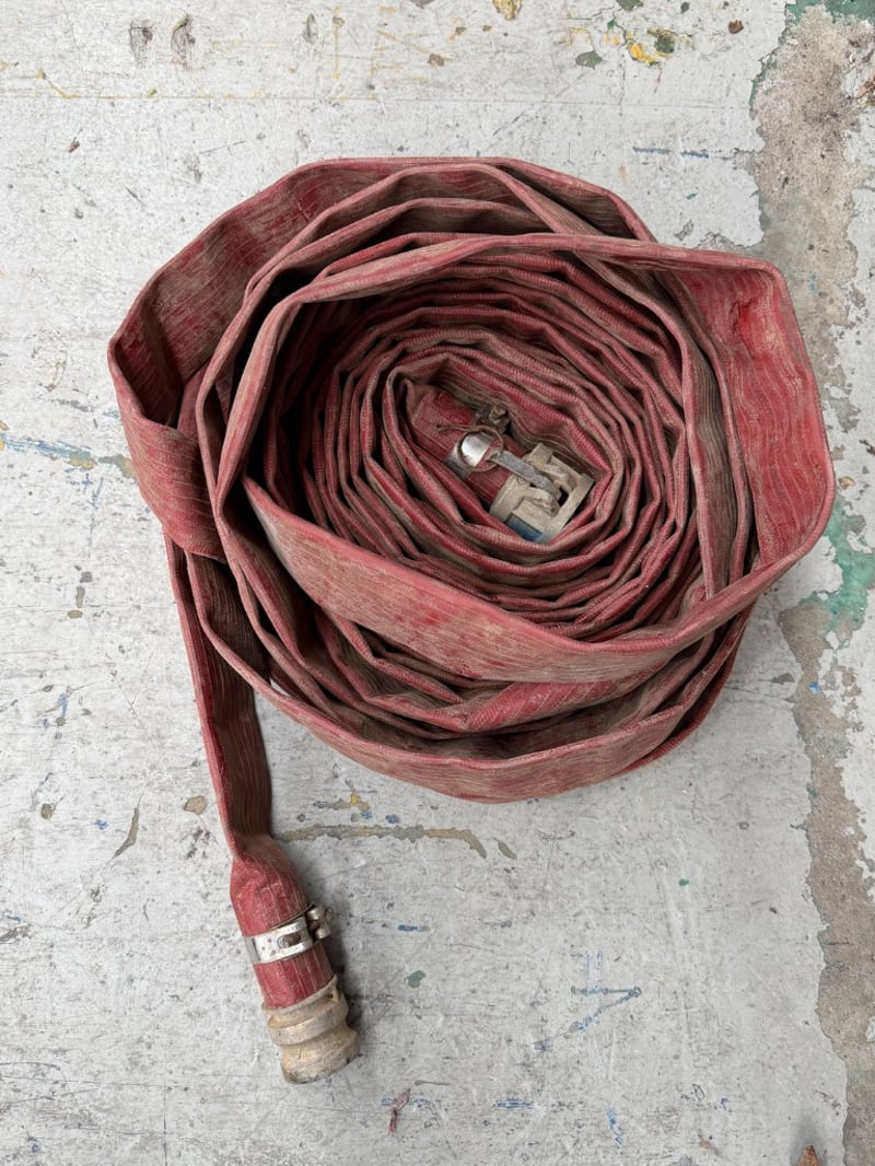 2xFire hose. Tightly coiled construction showing typical wear consistent with industrial use. Features reinforced stitching along the length and metal band securing the coil. Includes nozzle attachment. Suitable for fire safety, garden use, or industrial applications.