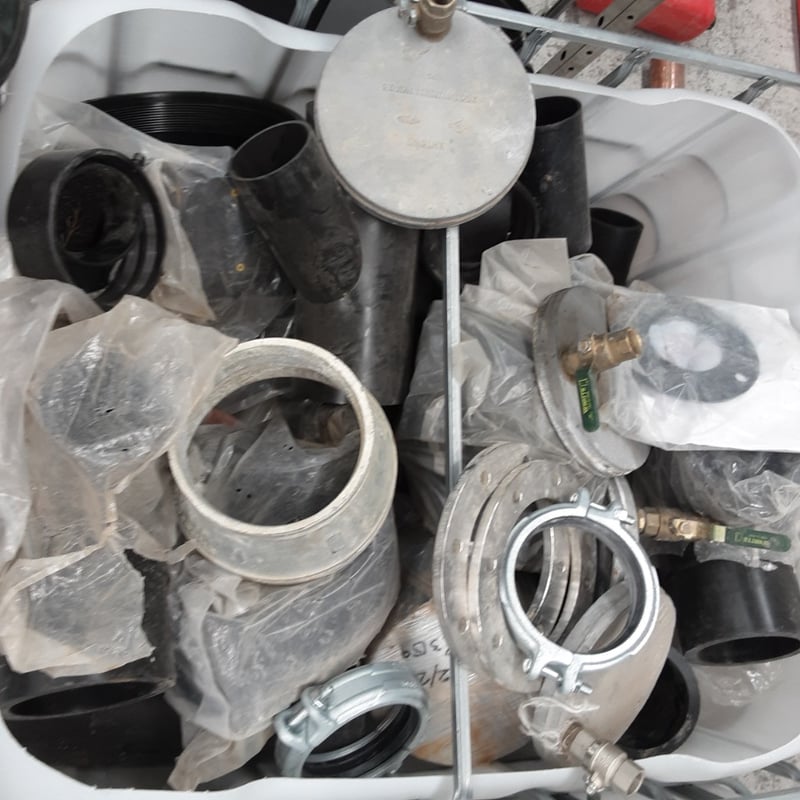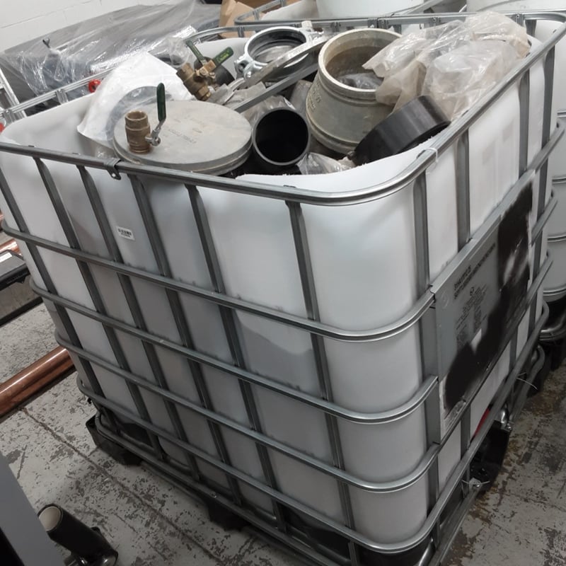 Large industrial tote with steel pallet frame, capacity approximately 1000 litres. Contents include assorted plumbing equipment, includes assorted PVC pipes, clamps, industrial hose attachments.