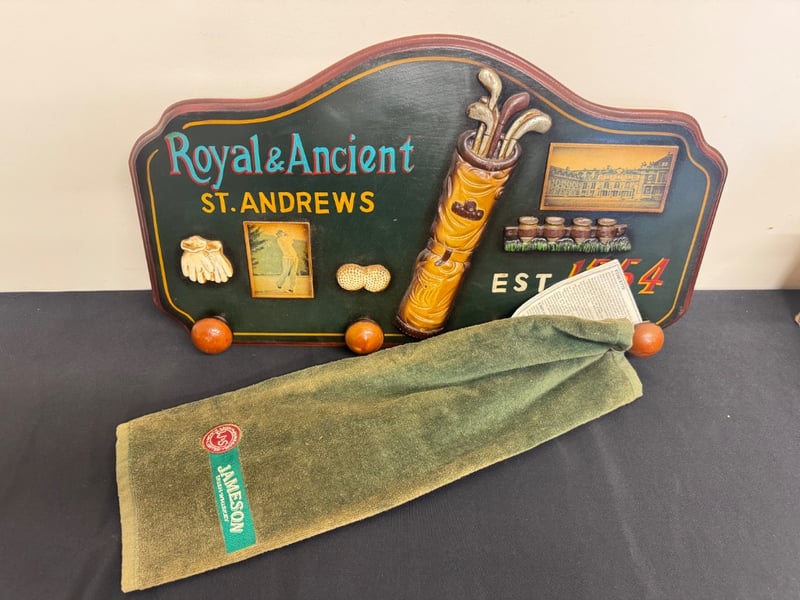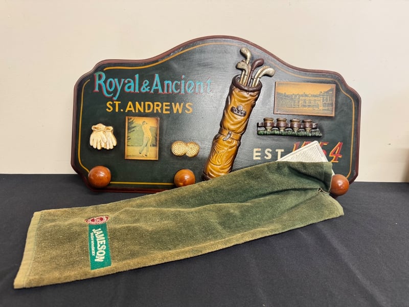ROYAL & ANCIENT ST. ANDREWS GOLF CLUB COMMEMORATIVE SIGN WITH VINTAGE TOWEL