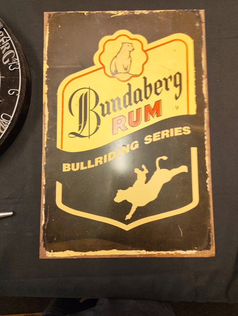 BUNDABERG RUM VINTAGE DARTBOARD WITH BULLRIDING SERIES TIN SIGN AND DART THROWER