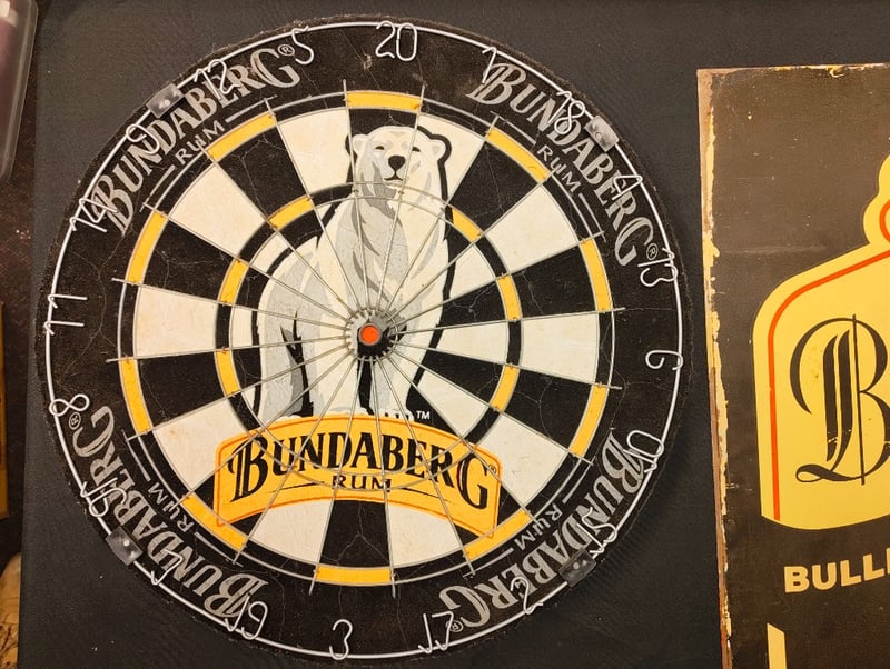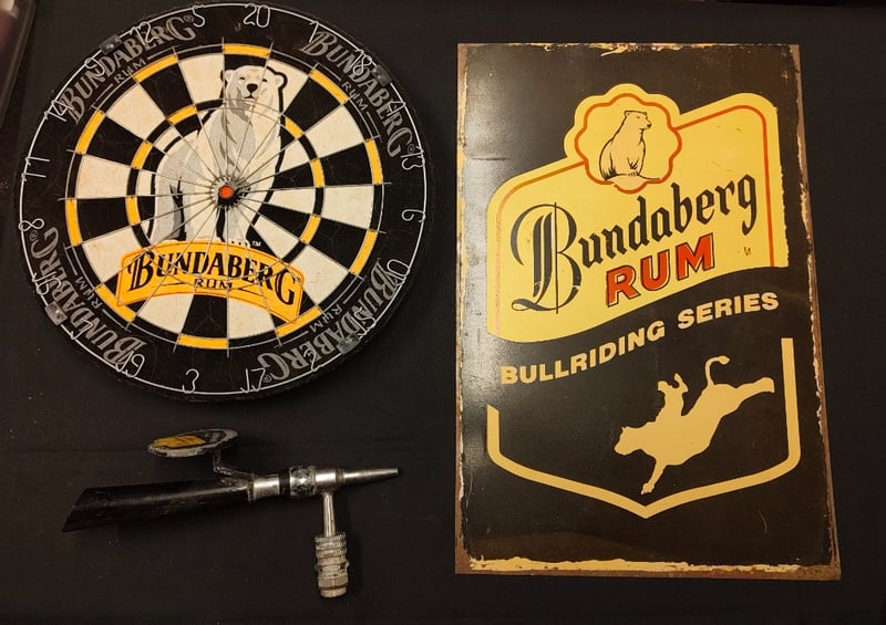 Vintage Bundaberg Rum Promotional Dartboard Featuring Polar Bear Motif With Black And Cream Segmented Face, Yellow And Black Outer Ring, And "Bundaberg Rum" Branding. Accompanied By Original Bullriding Series Tin Sign With Weathered Patina And Vintage Steel Dart Thrower With Black Handle And Metal Components. Classic Australian Rum Brand Advertising Memorabilia From Mid-20Th Century.