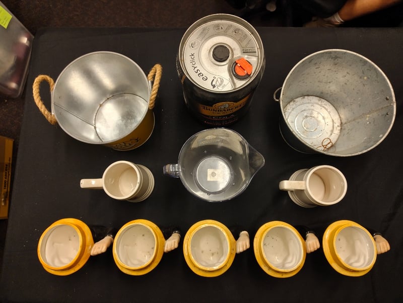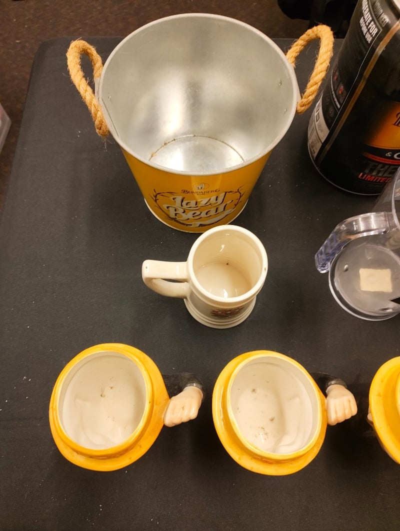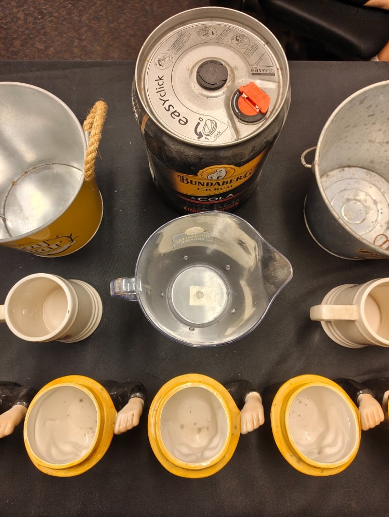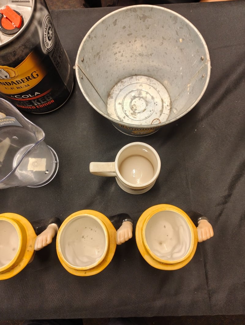 VINTAGE BUNDABERG RUM BAR SET WITH CERAMIC SERVING VESSELS Charming Mid-Century Bar Service Collection Featuring A Bundaberg Rum Branded Metal Ice Bucket With Rope Handles, Matching Metal Pitcher, Galvanised Metal Serving Vessel, Glass Blender Jug, Five Ceramic Mugs With Ochre-Yellow Glaze And Natural Timber Handles, And Two Cream Ceramic Measuring Jugs. The Set Exemplifies Vintage Entertaining Aesthetics With Mixed Materials Including Brushed Aluminium, Glazed Ceramics, And Period-Appropriate Glassware. Rope-Handled Ice Bucket Displays Prominent Bundab Condition: Fair - Refer To Images 584580+9