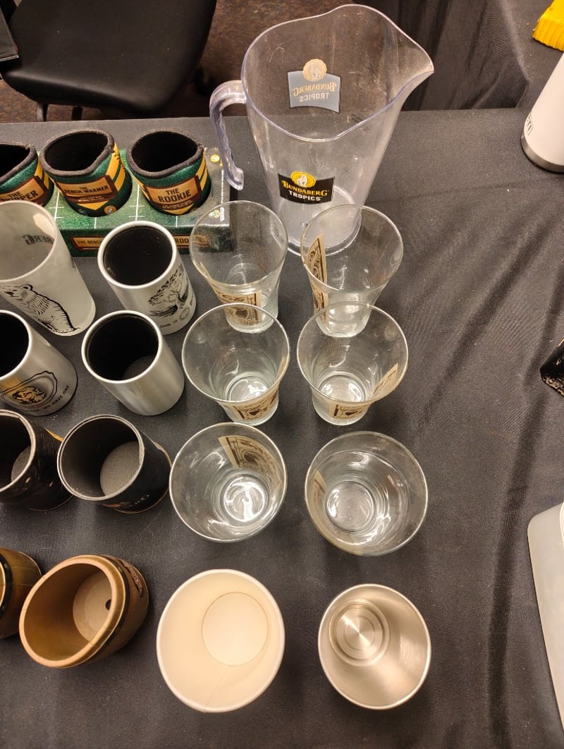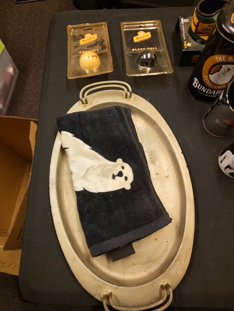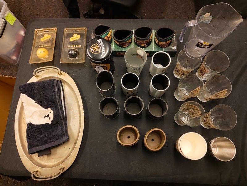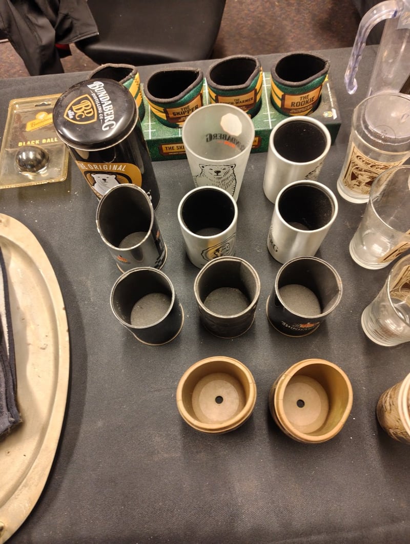 Comprehensive Bundaberg Rum Promotional Collection Featuring Cue Balls (Cue And Black Ball In Original Packaging), Branded Ceramic And Glass Drinkware In Various Sizes, Metal-Rimmed Shot Glasses With Green And Gold Banding, Clear Glass Tumblers And Mixing Pitcher, Wooden-Base Serving Vessels, Stainless Steel Lids, Branded Towel With Polar Bear Motif, And Assorted Barware Accessories. Vintage Promotional Merchandise From Australian Rum Distillery.