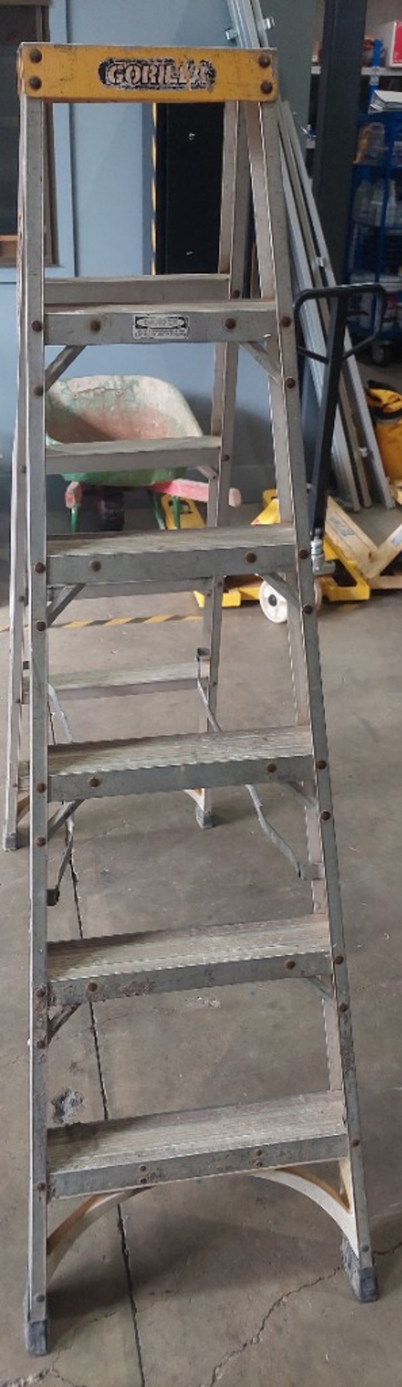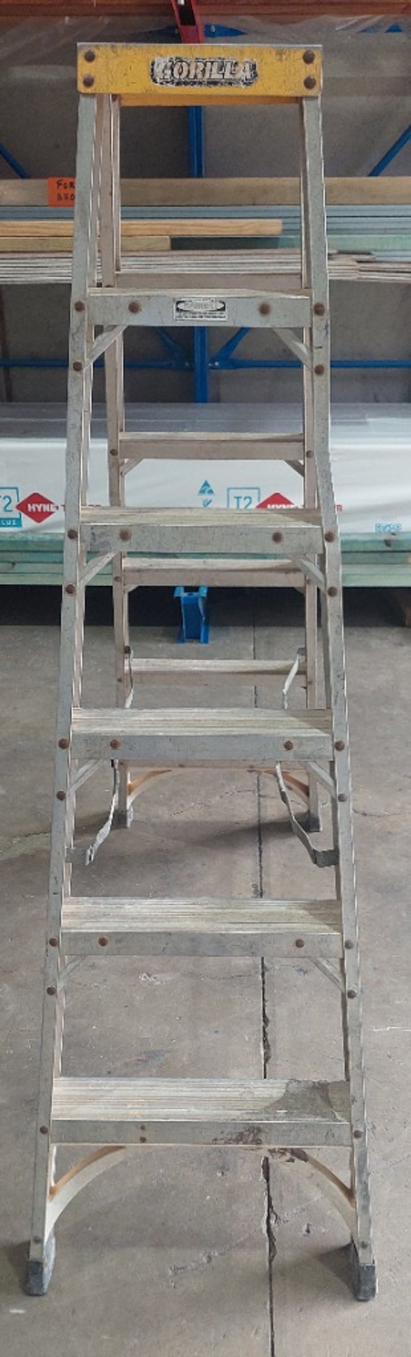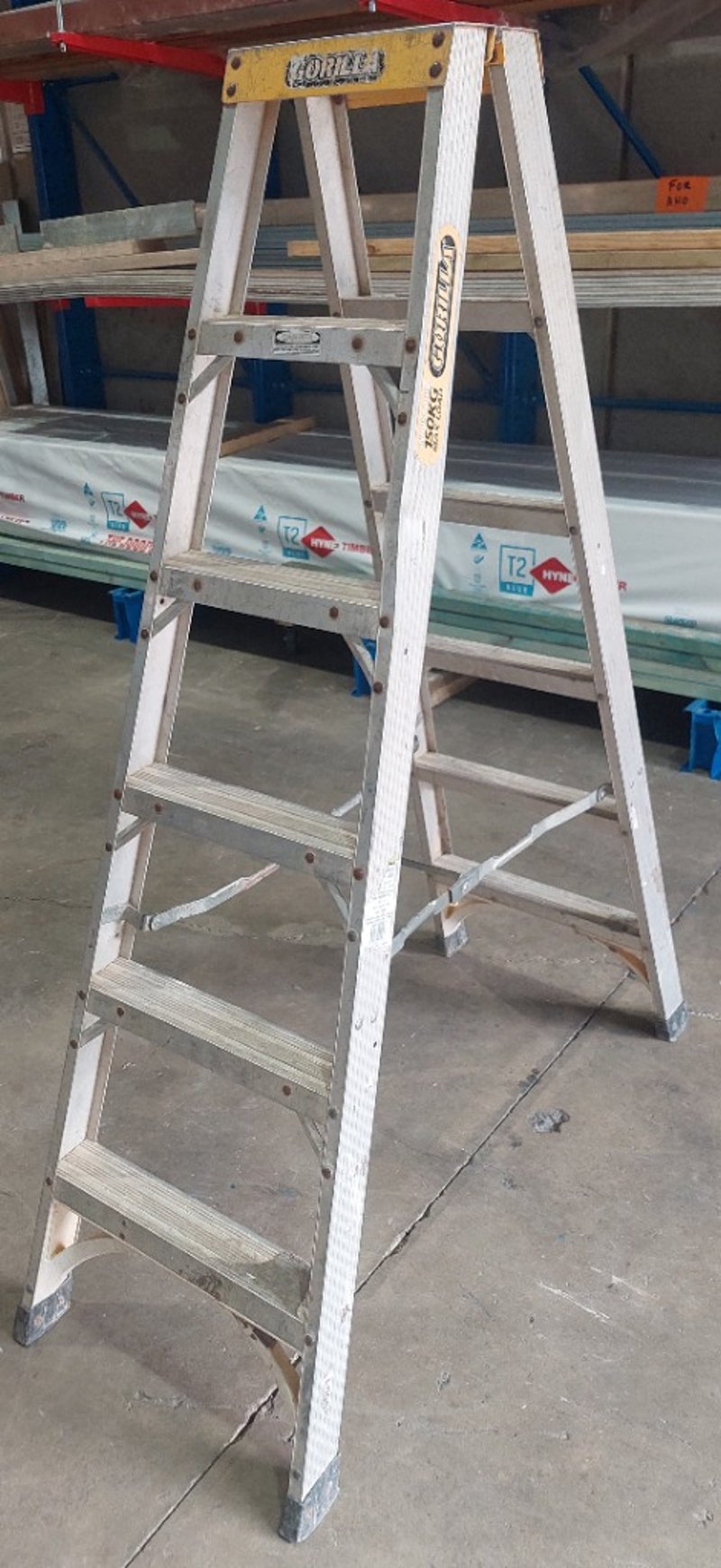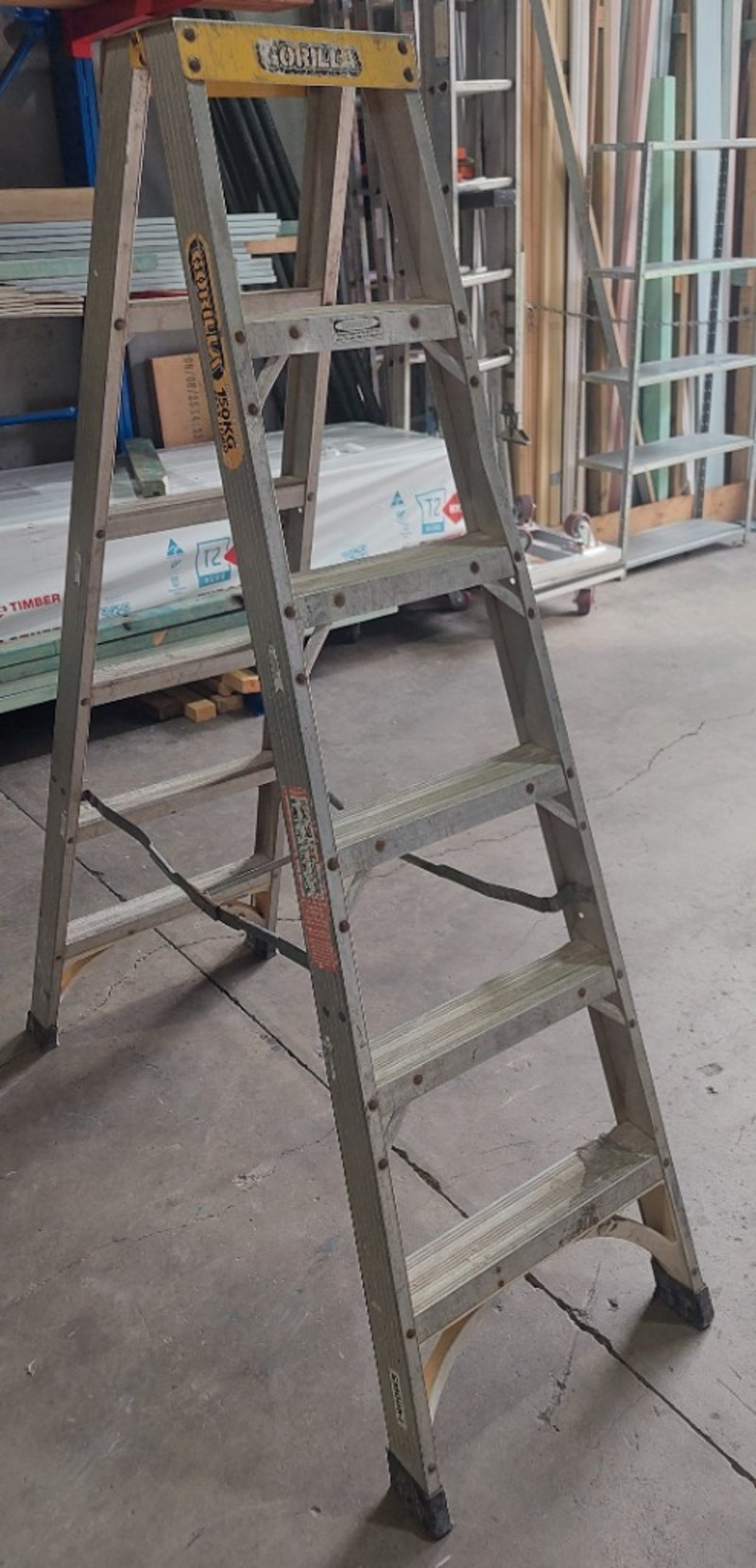 Gorilla 150kg Industrial rated aluminium double-sided ladder. Notes: signs of wear.