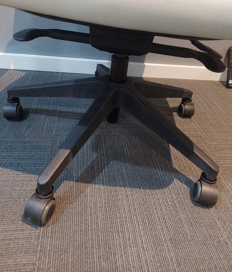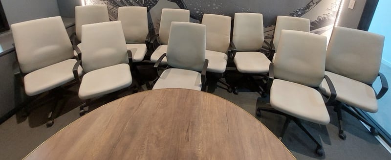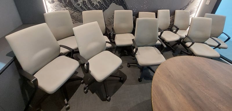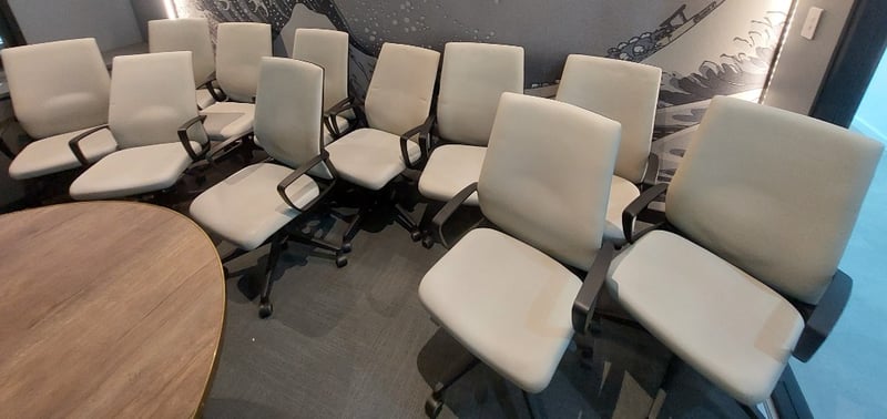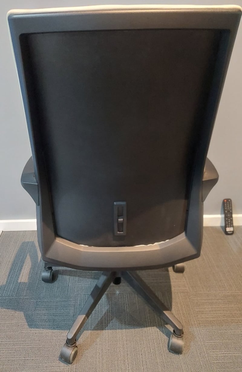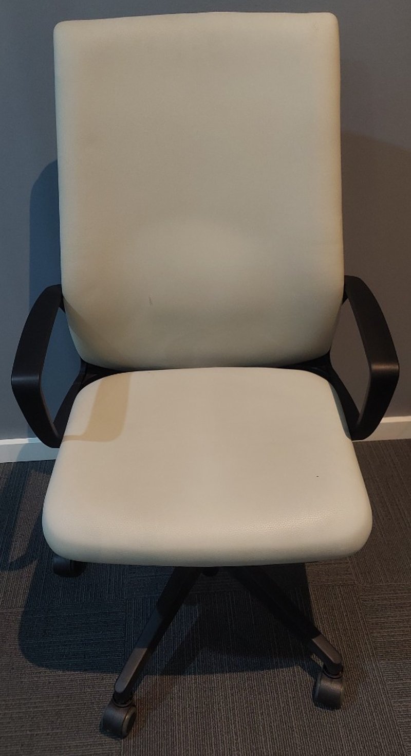Office chairs biege with black arm rests and black 5 star base on casters. Dims: 106cm H, 60cm W, 55cm D Qty 11 Sold as lot. Notes: signs of wear.