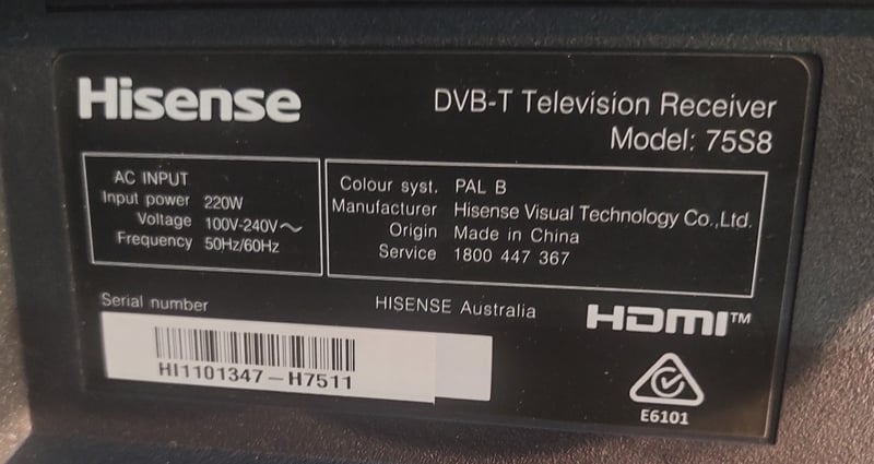 Smart TV - Hisense 75S8, 75" 4K UHD LED, remote control, S/N: HI1101347-H7511, wall mounted on bracket”. Note: buyer to provide tools to remove bracket