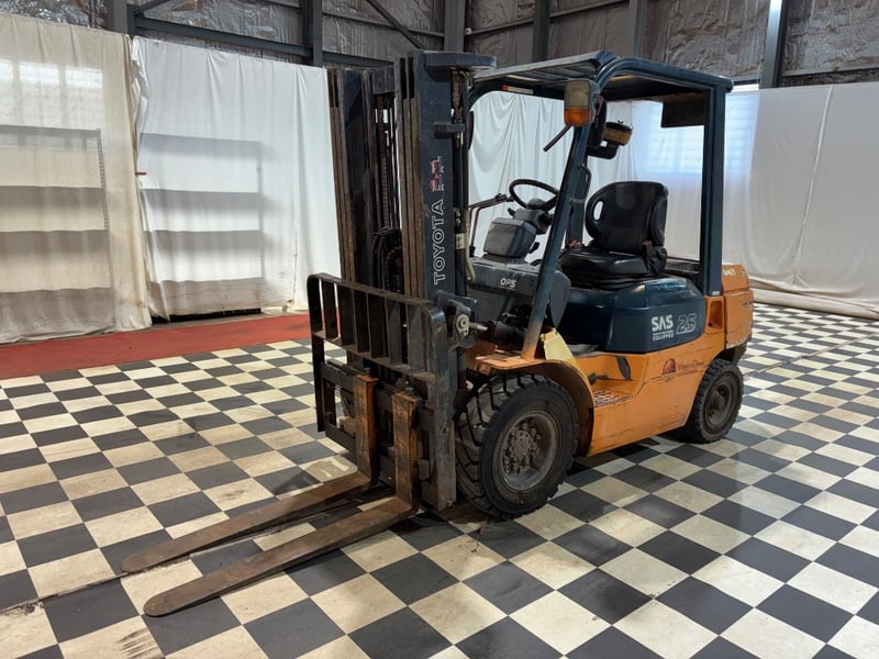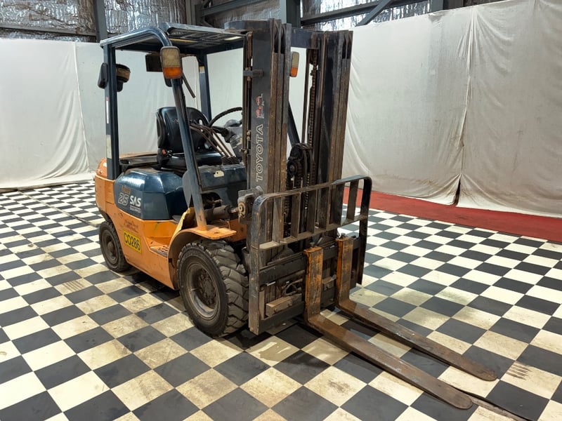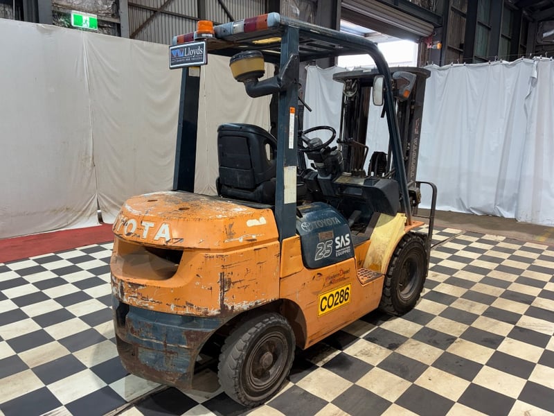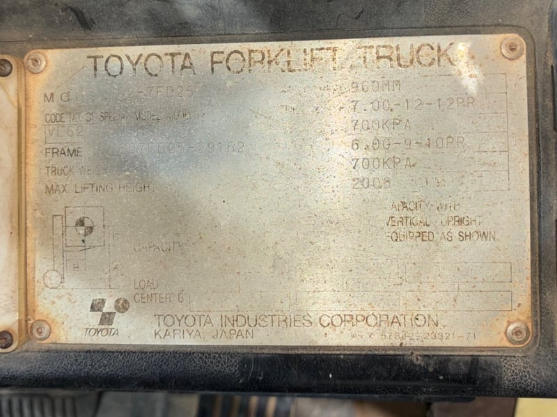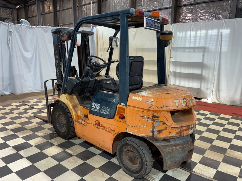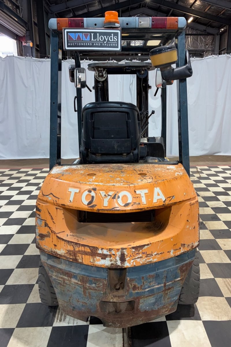 Toyota 62-7FD25 Forklift Manufacture Year: Unknown Make: Toyota Model: 62-7FD25 Type: Forklift Serial Number: 607FD25-29162 Configuration: Rubber Cabin: Open Hour Meter Indicated: 7359 hours Engine: 4-Cylinder Diesel Engine Make: Toyota Engine Model: 1DZ-II Buckets: Sideshift attachment (Model E62), load backrest, forks Colour: Orange Description/extras: Toyota 25 SAS Forklift Truck ( 2.5t ). Surface rust throughout , significant paint deterioration and flaking , worn tyres with visible tread wear, , rust on mast assembly and lifting mechanism. (Whilst high volumes of incoming products prevent us from testing every incoming item individually - Lloyd's do not knowingly sell faulty items. Inspection is welcomed) (Key #CTM10 , NT) Lloyds stock #153997+1
