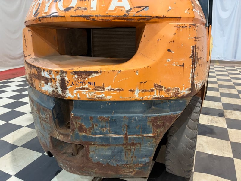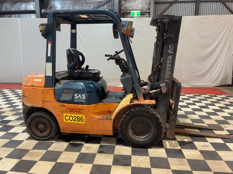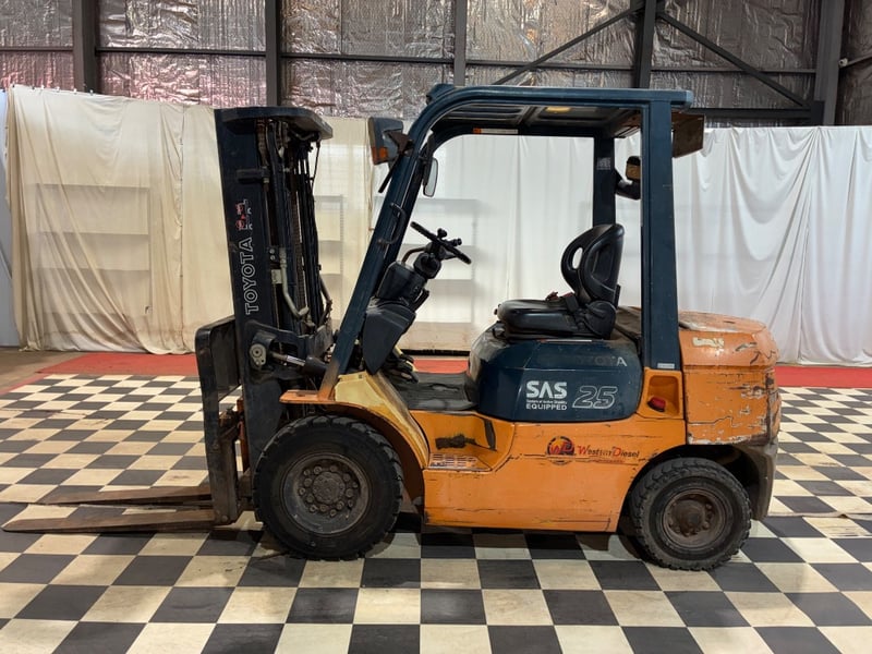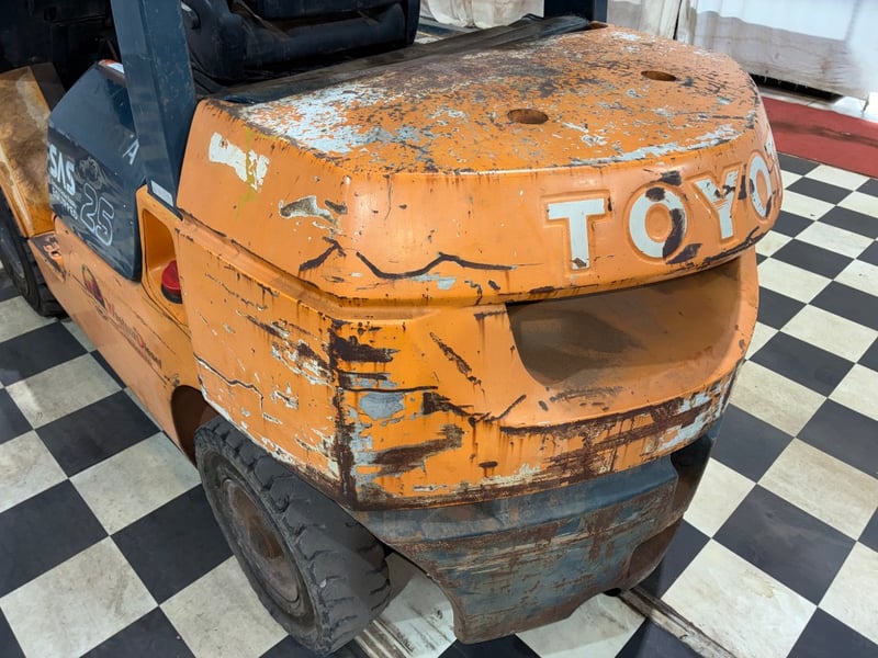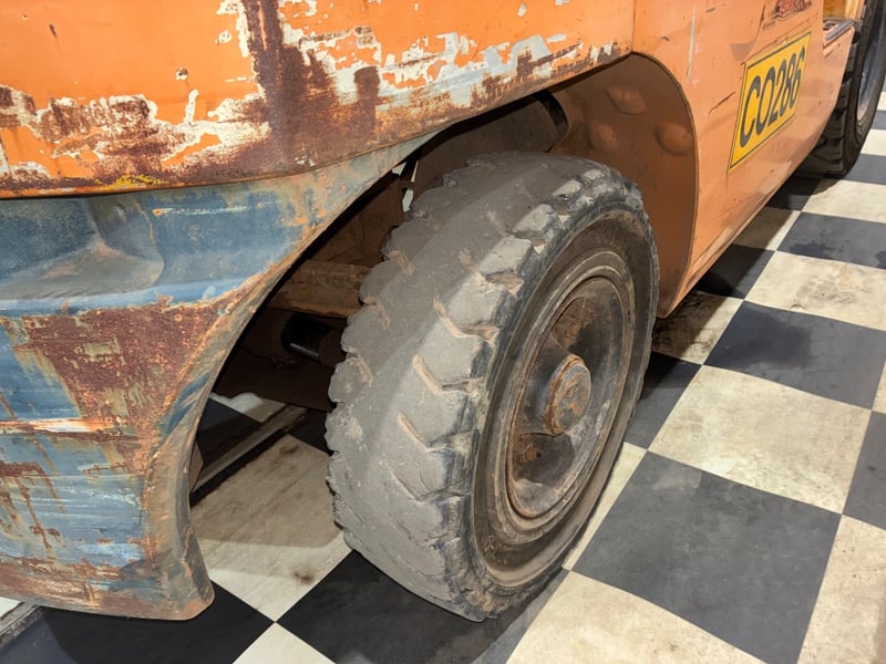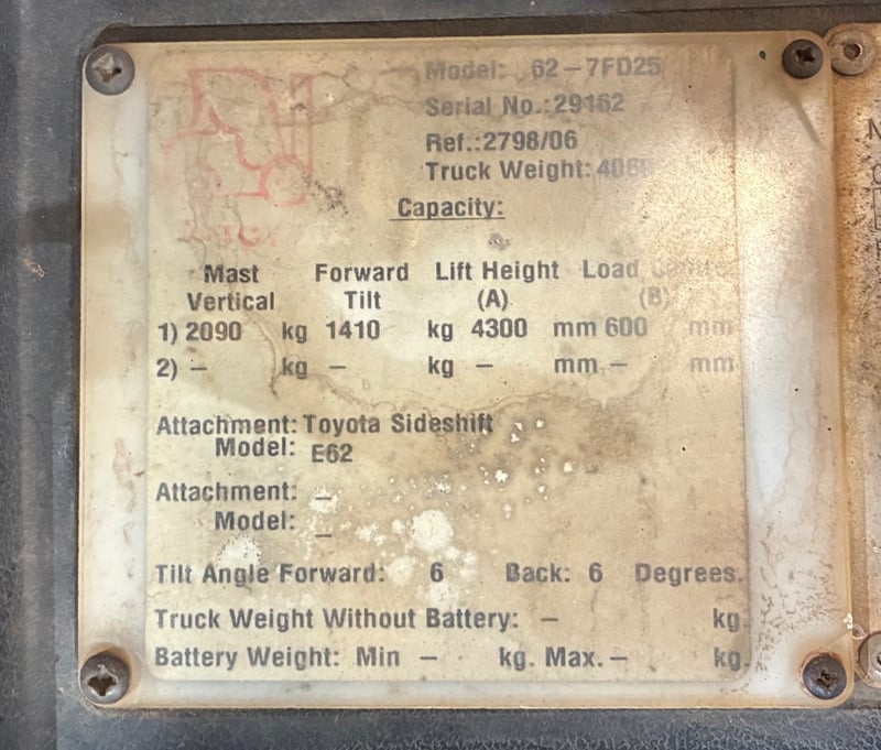 Toyota 62-7FD25 Forklift Manufacture Year: Unknown Make: Toyota Model: 62-7FD25 Type: Forklift Serial Number: 607FD25-29162 Configuration: Rubber Cabin: Open Hour Meter Indicated: 7359 hours Engine: 4-Cylinder Diesel Engine Make: Toyota Engine Model: 1DZ-II Buckets: Sideshift attachment (Model E62), load backrest, forks Colour: Orange Description/extras: Toyota 25 SAS Forklift Truck ( 2.5t ). Surface rust throughout , significant paint deterioration and flaking , worn tyres with visible tread wear, , rust on mast assembly and lifting mechanism. (Whilst high volumes of incoming products prevent us from testing every incoming item individually - Lloyd's do not knowingly sell faulty items. Inspection is welcomed) (Key #CTM10 , NT) Lloyds stock #153997+1
