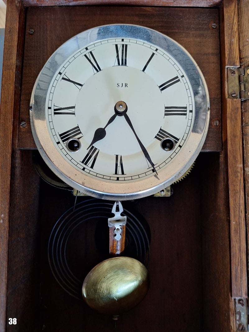 SJR INITIALED CHIMING TIMBER WALL CLOCKItem Size: Height: 46cm, Width: 21.5cm, Depth: 10cmUnknown Maker. Key And Pendulum In Clock. Working Condition.584589+38