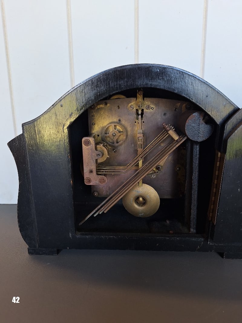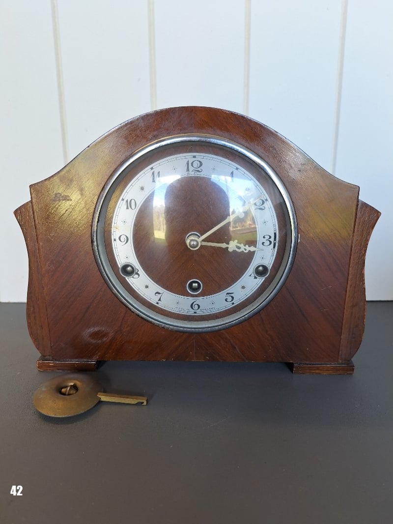 VINTAGE BENTIMA CHIMING TIMBER MANTEL CLOCK.