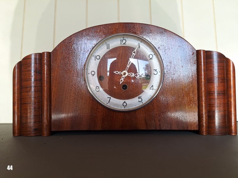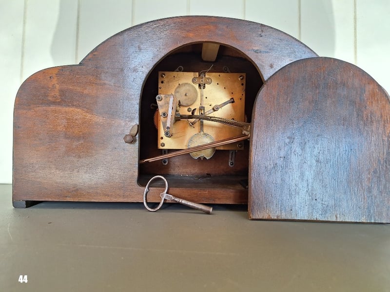 VINTAGE CHIMING TIMBER MANTEL CLOCK.Item Size: Height: 24.5cm, Width: 46cm, Depth: 17cmMaker Unknown, Would Be On The Movement. Made In Germany. Quarterly Chimes. Key And Pendulum Weight In The Clock. Working Condition584589+44