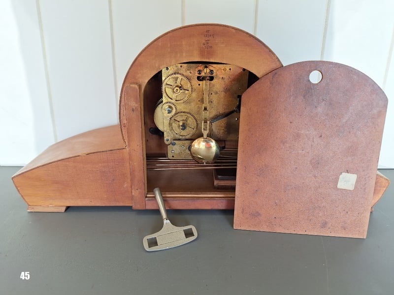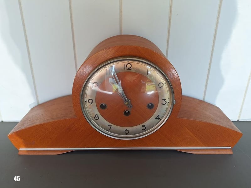 VINTAGE FHS HERMIE CLOCK CO. TIMBER QUARTERLY CHIMING MANTEL CLOCK.Item Size: Height: 24cm, Width: 44.5cm, Depth: 13.5cmMade In Germany. Key And Weight In Clock. Working Condition.584589+45
