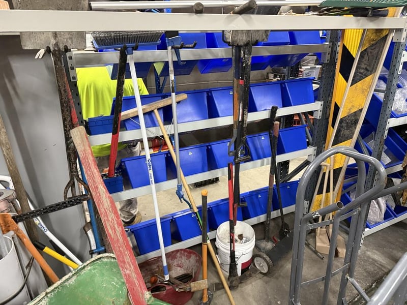 Stock Racking - 4x bays (back-to-back), 3x bays with 20 stock tubs and 1x open bays with tool hangers, each bay 1800mm x 1800mm (Notes: Contents not included. Buyer must provide tools to dismantle the racking)