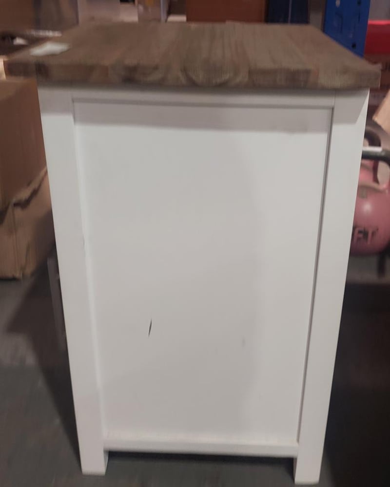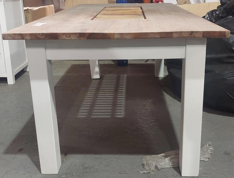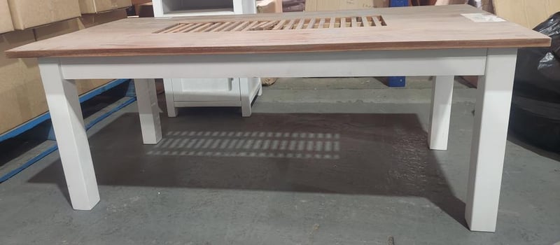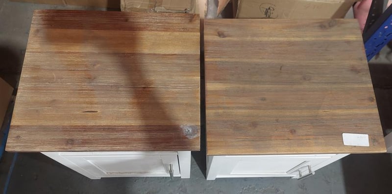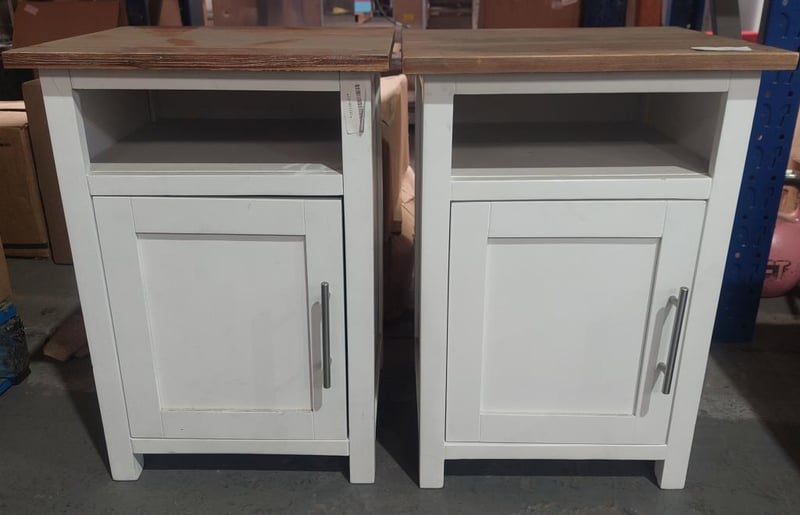 Wood and white dining table and x2 left-hand side hinge bedside tables. Dinning table dims: 120cm L, 60cm W, 46cm H. Bedside table Dims: Sold as a lot.