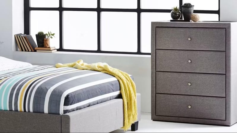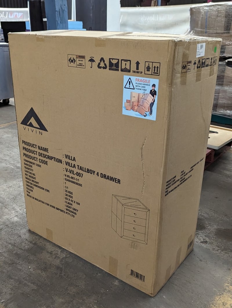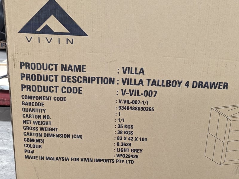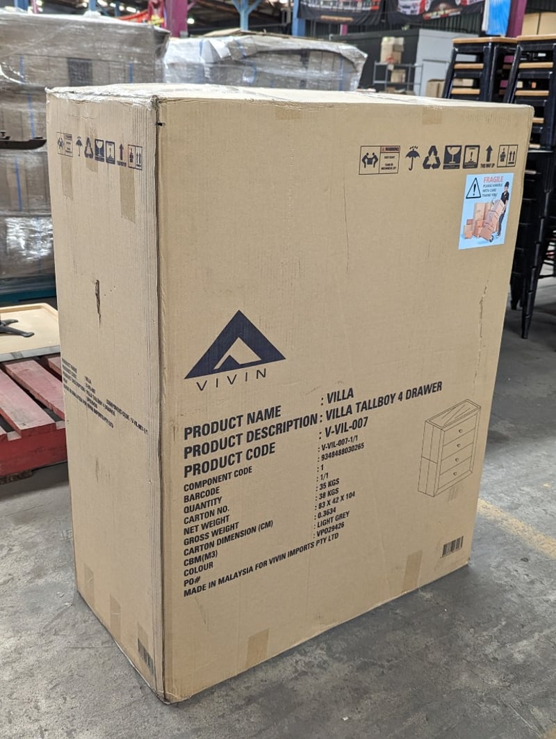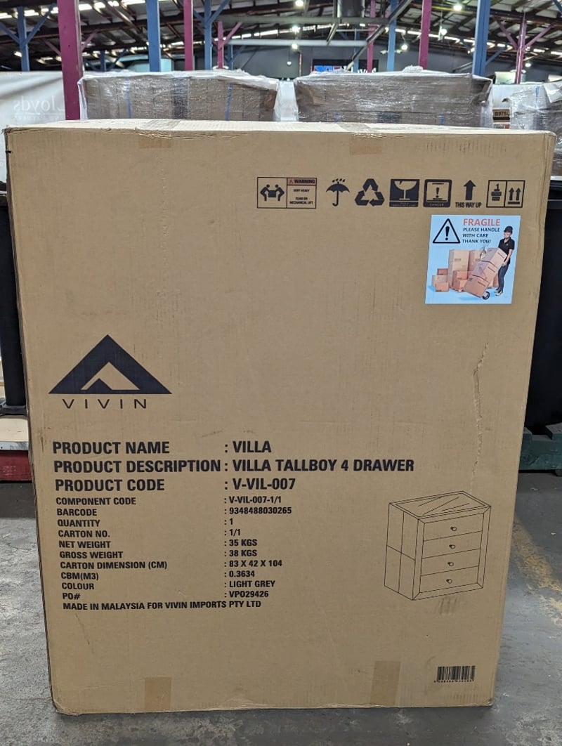 RRP $649Villa Tallboy 4 Drawer, Light Grey.Product No: V-VIL-007 DIMS 83 X 42 X 104 CM