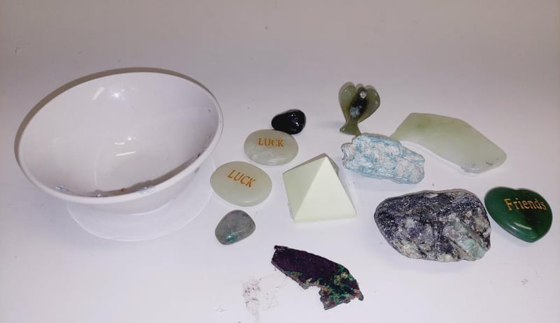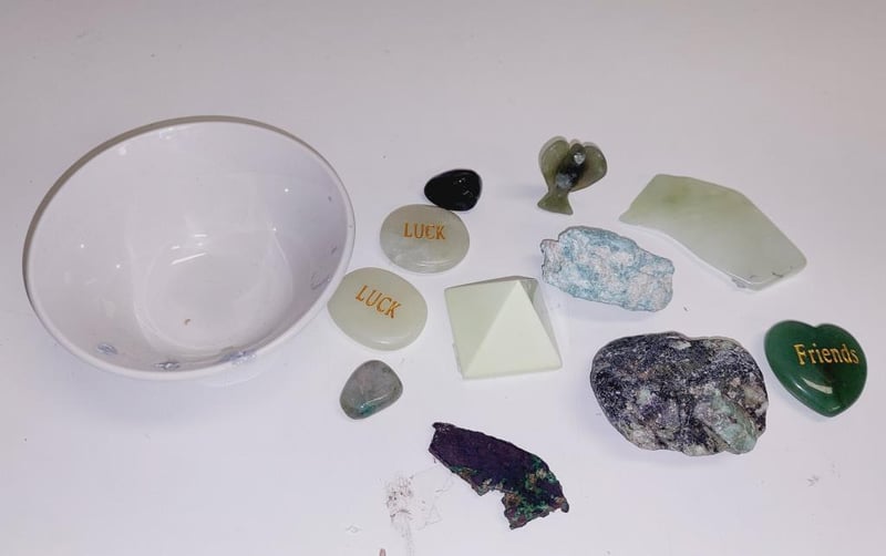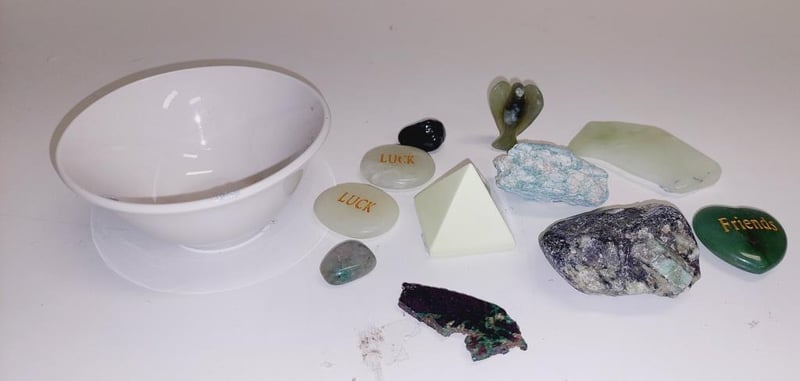 ASSORTED CRYSTALS AND STONES INCLUDING JADE LEMON CHRYSOPHASE AND MORE... SOLD AS A LOT.