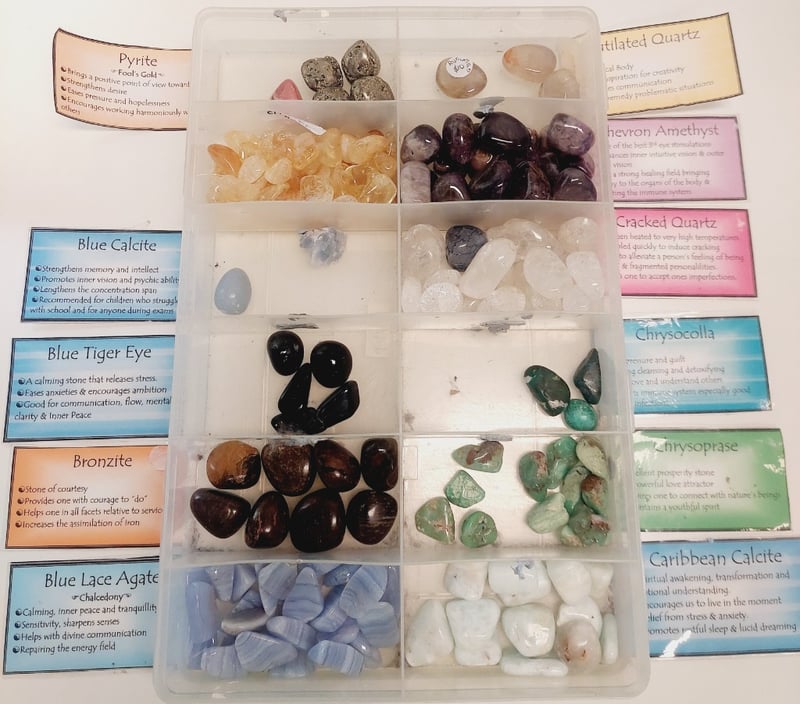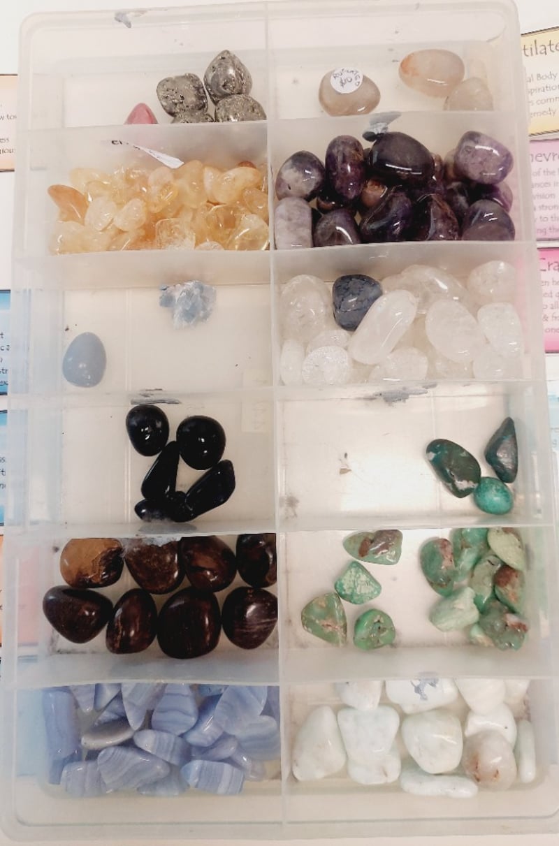 ASSORTED CRYSTALS INCLUDING, BLUE LACE AGATE, BRONZITE, BLUE TIGERA EYE, BLUE CALCITE, PYRITE, RUTILATED QUARTZ, CHEVRON AMETHYST, CRACKED QUARTZ, CHRYSOCOLLA, CHRYSOPRASE AND CARIBBEAN CALCITE.SOLD AS A LOT.Condition: Good - Refer To Images488378+16