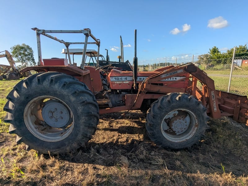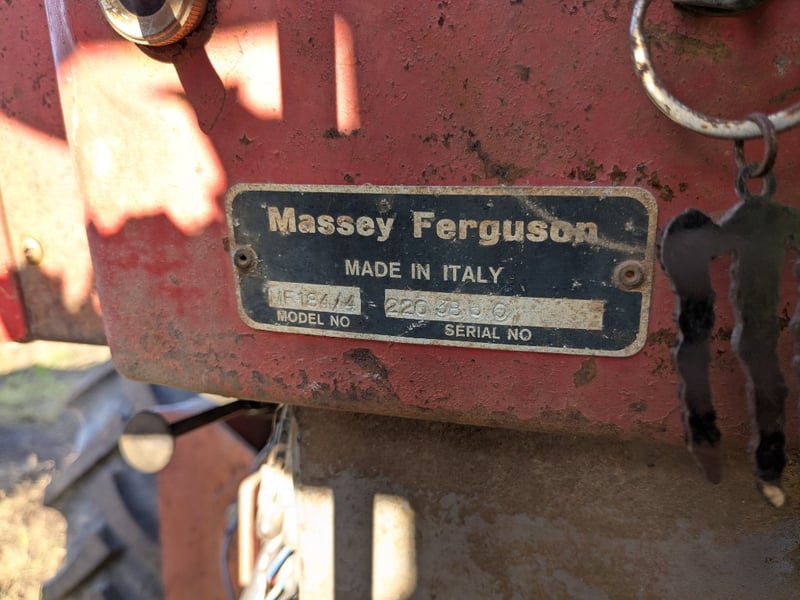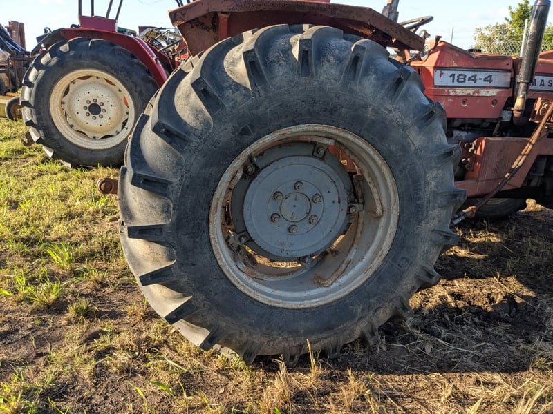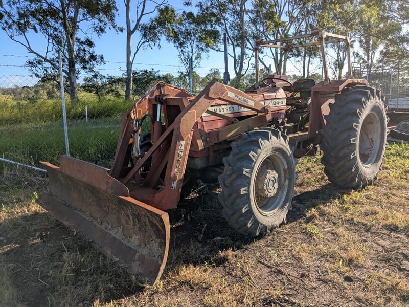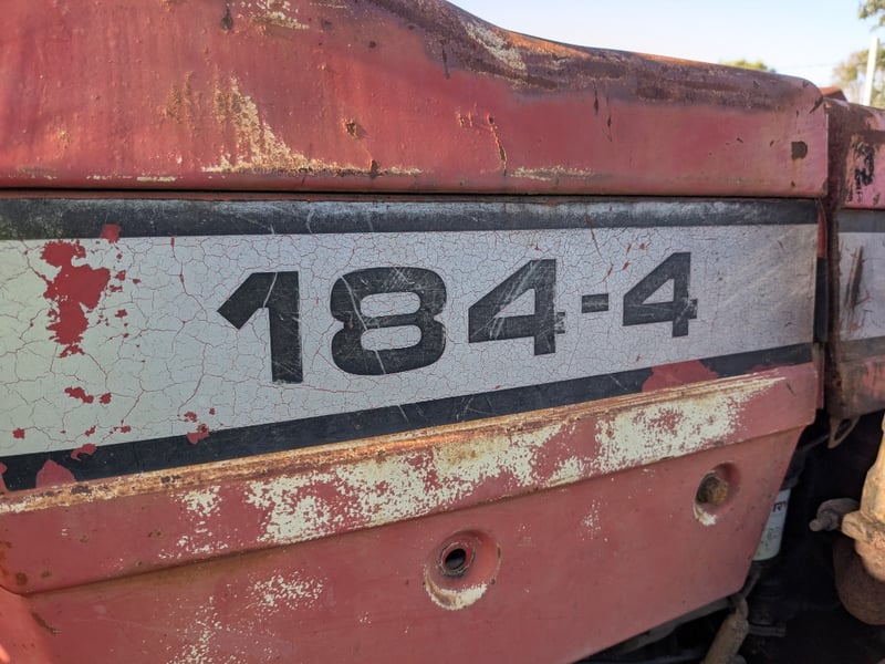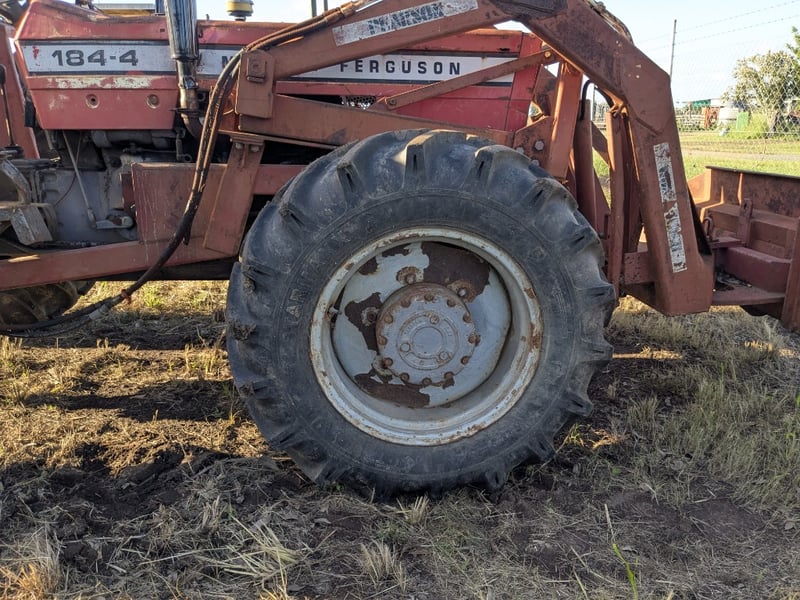 Massey Ferguson 184-4 Tractor Year: Unknown Make: Massey Ferguson Model: MF 184/4 SN: 2203860 Engine: 4-cylinder diesel (Perkins) Power: 68 hp (50.7 kW) PTO Power: ~62 hp (46.2 kW) Fuel Capacity: 16 gal (60.6 L) Hours: not sighted Mechanical & Hydraulics (184-4 Tractor) Drive: 4WD Transmission: Multiple/Sync Shuttle Steering: Hydrostatic power steering Brakes: Dry disc Hydraulics: Open center, 28.1 gpm (106.4 lpm) total flow Rear Hitch: Category II, 5842 lbs (2649 kg) lift capacity