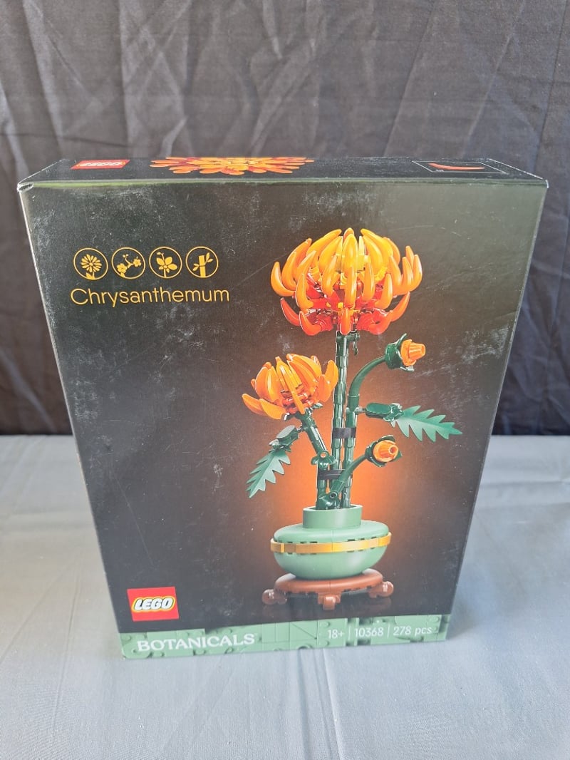 Lego Botanicals Chrysanthemum Building Set (10368) Featuring 278 Pieces. Includes Detailed Orange And Red Chrysanthemum Flowers With Green Foliage, Decorative Pot With Base, And Botanical Display Stand. Age 18+. Original Sealed Packaging With Visible Wear Consistent With Storage.
