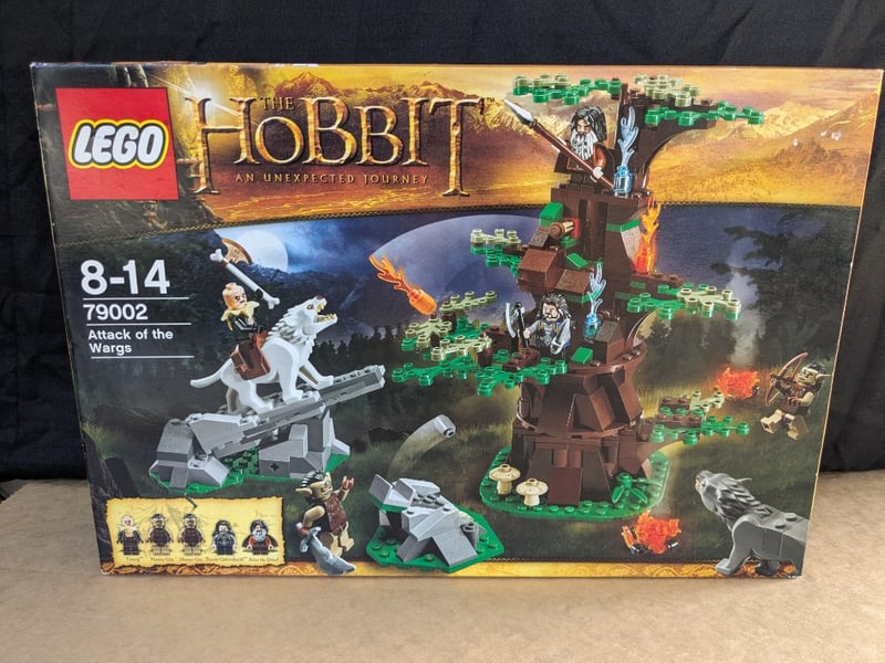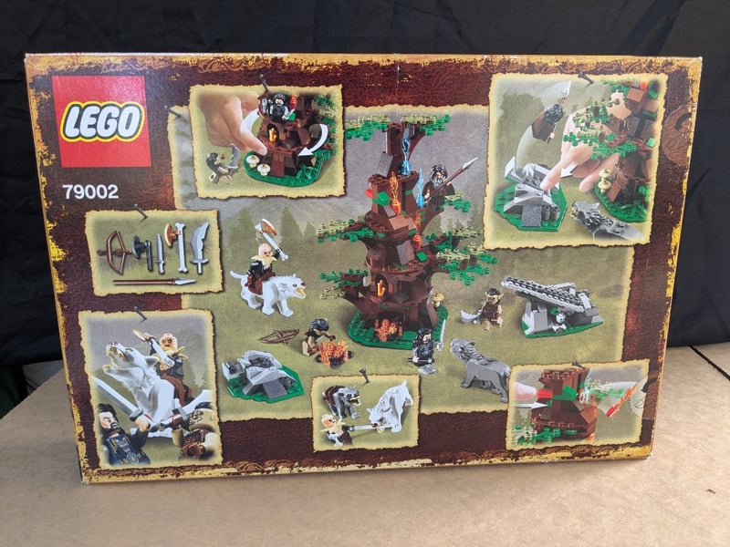 LEGO THE HOBBIT 79002 ATTACK OF THE WARGS SETLego The Hobbit "An Unexpected Journey" Set 79002 Featuring The Attack Of The Wargs Scene. Complete With Brown Tree Fortress Structure, Green Foliage Elements, Five Minifigures, White Warg Creatures, Grey Stone Platforms, And Flame Accessories. Original Box With Detailed Imagery And Minifigure Lineup Displayed On Packaging.Condition: Fair - Refer To Images584572+257