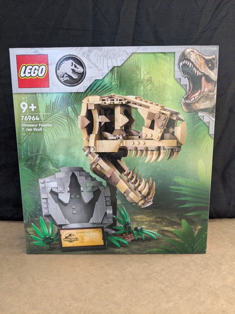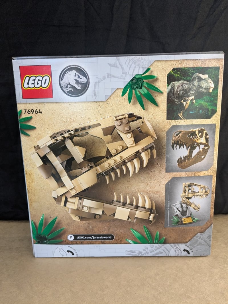 LEGO JURASSIC WORLD DINOSAUR FOSSILS T. REX SKULL SET 76964Lego Jurassic World Set 76964 Featuring A Buildable T. Rex Skull Fossil With Articulated Jaw Mechanism And Detailed Bone Structure. Includes Display Stand With Informational Plaque And Decorative Foliage Elements. Age Rating 9+. Complete With Original Packaging Showing Front And Back Box Art Displaying The Assembled Skull Model And Component Details.Condition: Good - Refer To Images584572+262