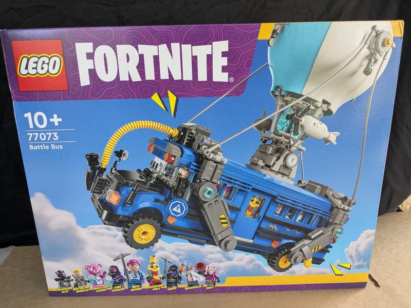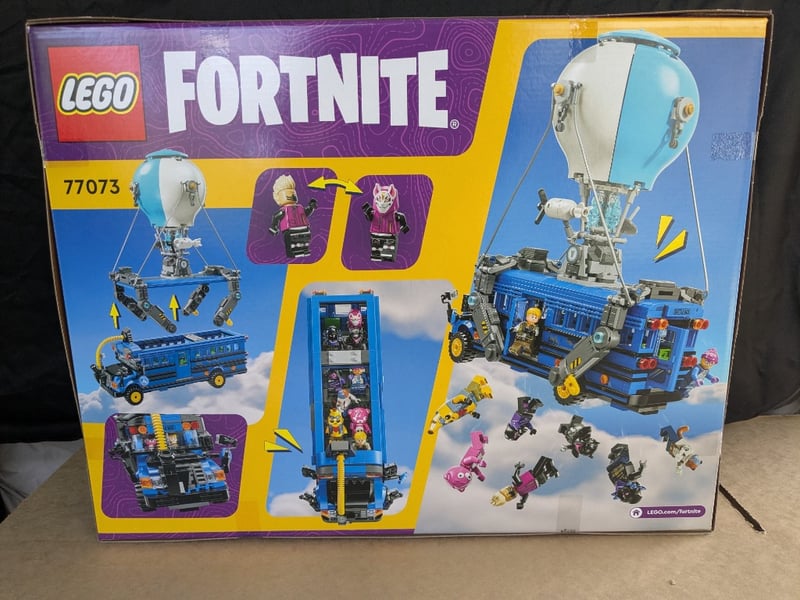 LEGO FORTNITE BATTLE BUS SET 77073Lego Fortnite Battle Bus Set 77073, Featuring The Iconic Blue Battle Bus With Detachable Helicopter, Rotating Propellers, And Opening Cargo Doors. Includes 8 Minifigures With Authentic Fortnite Character Designs. Set Designed For Ages 10+. Unopened, Factory-Sealed Box With Vibrant Purple And Blue Packaging Displaying Detailed Product Imagery And Minifigure Lineup.Condition: Good - Refer To Images584572+273