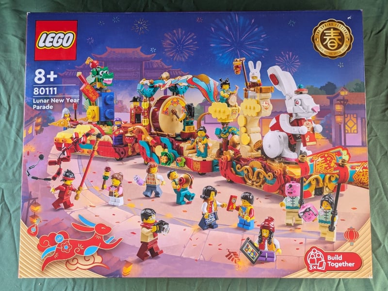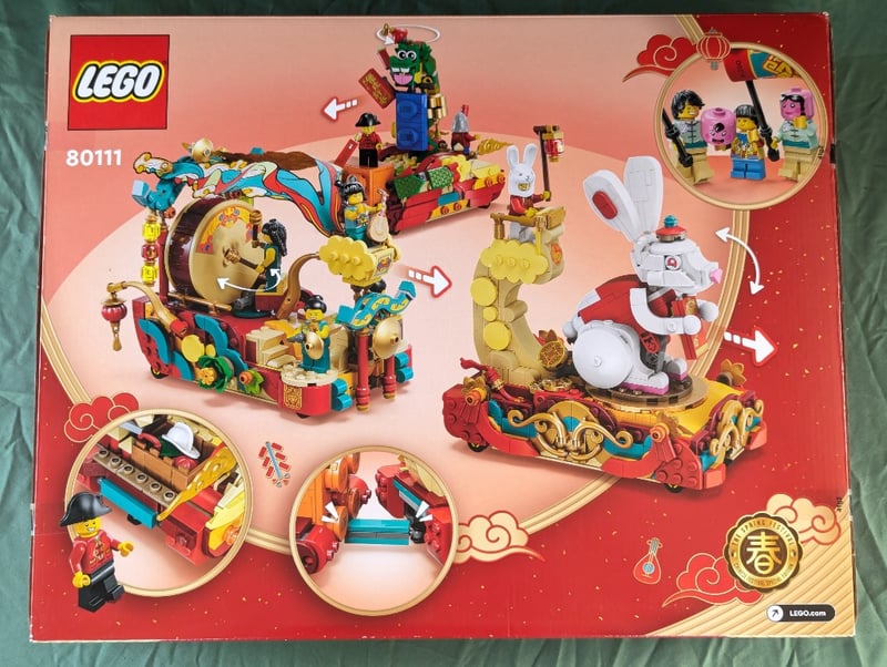 LEGO 80111 LUNAR NEW YEAR PARADE SETLego Set 80111 Featuring An Elaborate Lunar New Year Parade Theme With Multiple Buildable Structures Including A Decorative Parade Float With Rotating Drum Mechanism, White Rabbit Character Vehicle, Traditional Chinese Architectural Elements, And Approximately 15 Minifigures. Set Includes Vibrant Red, Gold, Turquoise, And Yellow Colour Scheme With Authentic Cultural Details Such As Lanterns, Fireworks Effects, And Traditional Ornamental Designs. Designed For Ages 8+. Features "Build Together" CoCondition: Good - Refer To Images584572+326